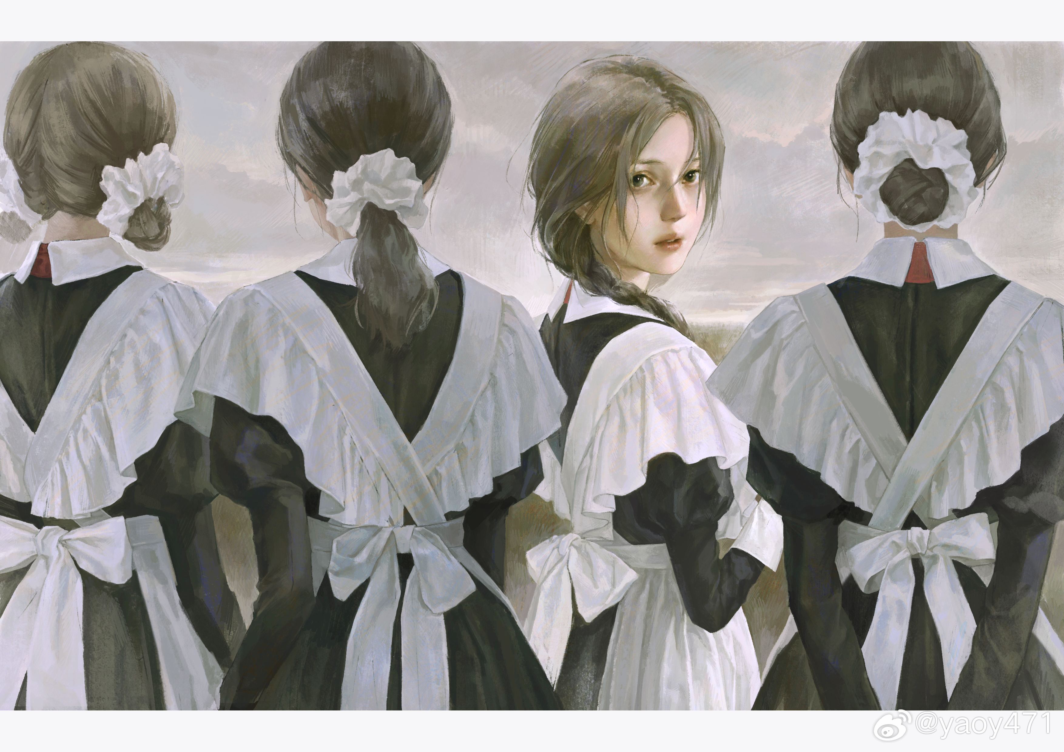 4girls absurdres apron arms_behind_back back_bow black_dress bow braid brown_hair chinese_commentary cloud cloudy_sky collar commentary_request cowboy_shot criss-cross_back-straps day double_bun dress expressionless field frilled_apron frills from_behind green_eyes hair_bun hair_ornament hair_over_shoulder hair_scrunchie highres juliet_sleeves letterboxed lipstick long_hair long_sleeves looking_at_viewer looking_back low_ponytail maid makeup multiple_girls original outdoors parted_bangs parted_lips ponytail puffy_sleeves realistic red_lips scrunchie short_hair single_braid single_hair_bun sky teeth upper_teeth_only white_apron white_bow white_collar white_scrunchie white_wrist_cuffs wrist_cuffs yaoy