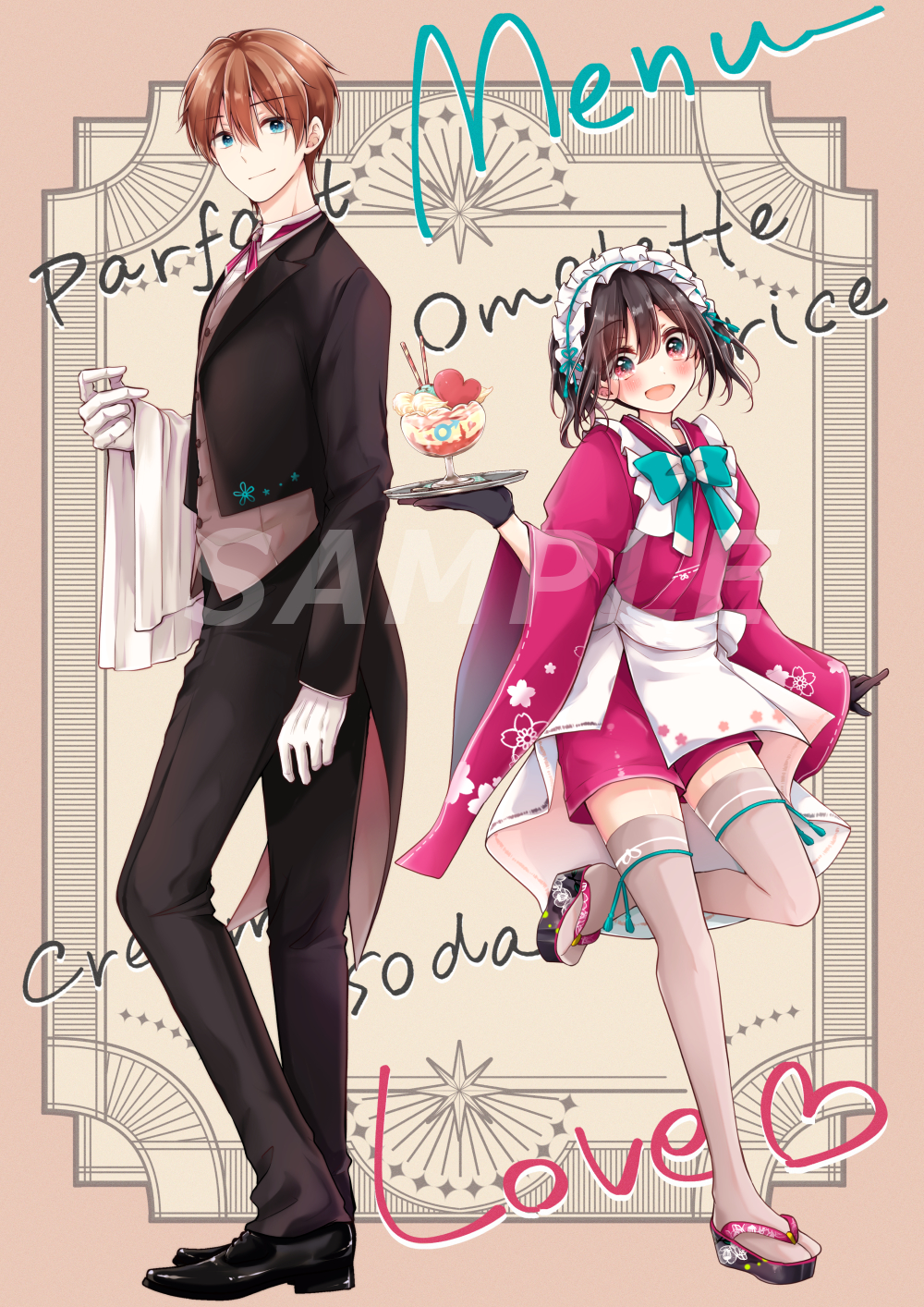 2boys apron banjou_azusa black_gloves black_hair black_suit blue_eyes blush bow brown_hair butler closed_mouth coattails crossdressing crossdressing_(mtf) formal_clothes frilled_apron frills gloves hair_between_eyes heart highres hiura_mihate holding holding_tray japanese_clothes kimono koisuru_(otome)_no_tsukurikata long_sleeves looking_at_viewer maid maid_apron maid_headdress male_focus male_maid mars_symbol midou_kenshirou multiple_boys open_mouth pants pink_eyes pink_kimono sandals shirt short_hair smile suit tailcoat thighhighs trap tray tuxedo wa_maid white_apron white_gloves wide_sleeves