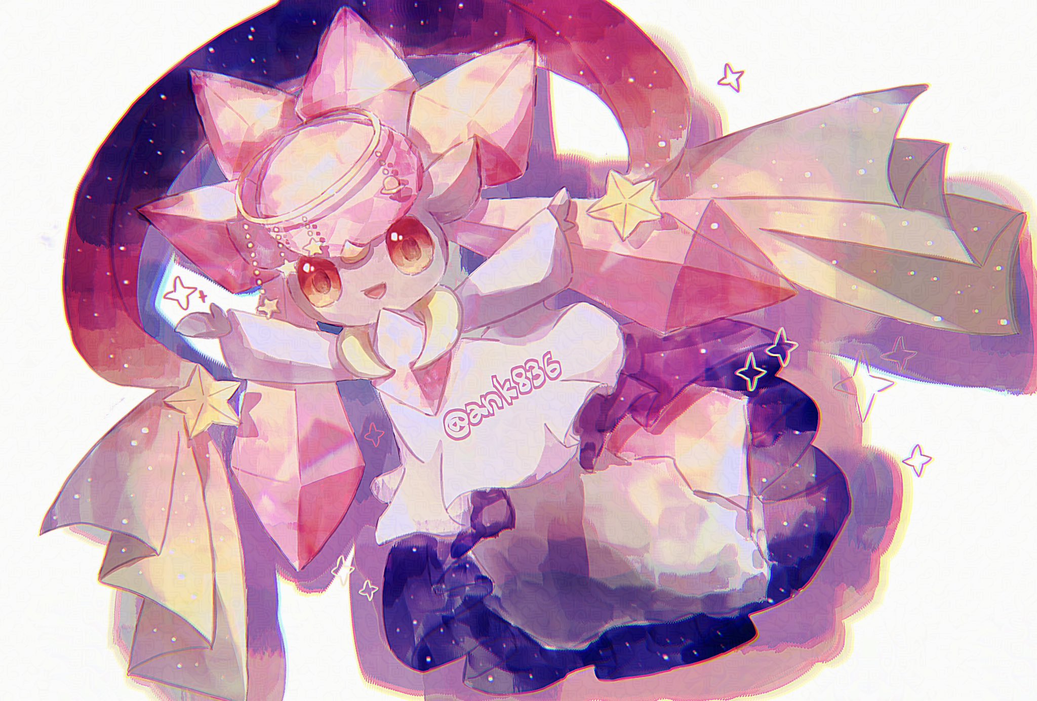 :d ank836 arm_up diancie full_body gem gen_6_pokemon highres legendary_pokemon looking_at_viewer mythical_pokemon nintendo no_humans open_mouth pink_gem pink_hair pokemon pokemon_(creature) pokemon_focus red_eyes smile solo star_ornament twitter_username white_background