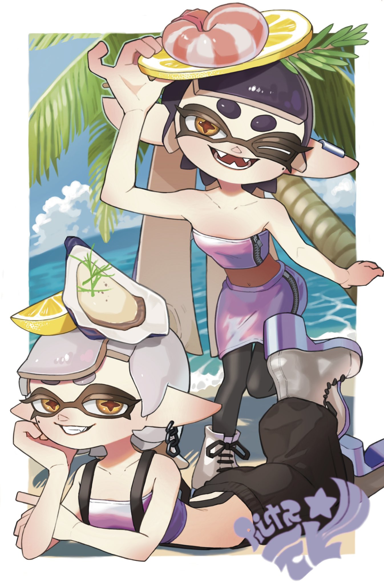 2girls adjusting_clothes adjusting_headwear baggy_pants beach black_hair bodystocking callie_(splatoon) callie_(summer_nights)_(splatoon) collarbone ear_piercing fangs food fruit grin highres inkling lemon lemon_slice looking_at_viewer lying marie_(splatoon) marie_(summer_nights)_(splatoon) mole mole_under_eye multiple_girls nintendo ocean official_alternate_costume on_stomach oyster palm_tree pants piercing platform_footwear pointy_ears shrimp skirt smile splatoon_(series) splatoon_3 strapless suspenders tentacle_hair tree tube_top water white_hair yattpki3wfyvsm5 yellow_eyes