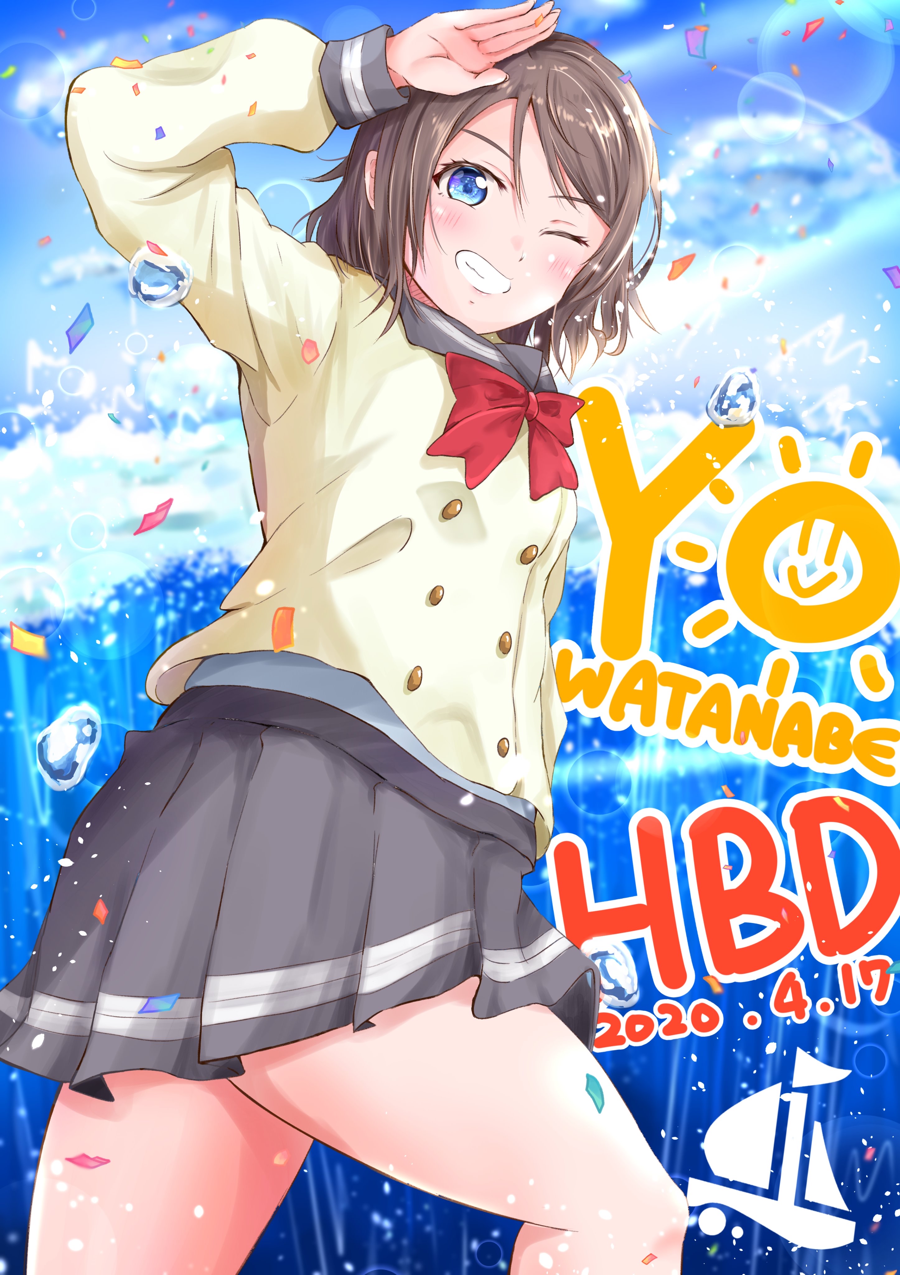 absurdres arm_up blush bubble buttons cloud highres love_live! love_live!_sunshine!! necktie ocean okahara_(sgvz3735) salute school_uniform serafuku skirt sky smile teeth thighs watanabe_you water waves