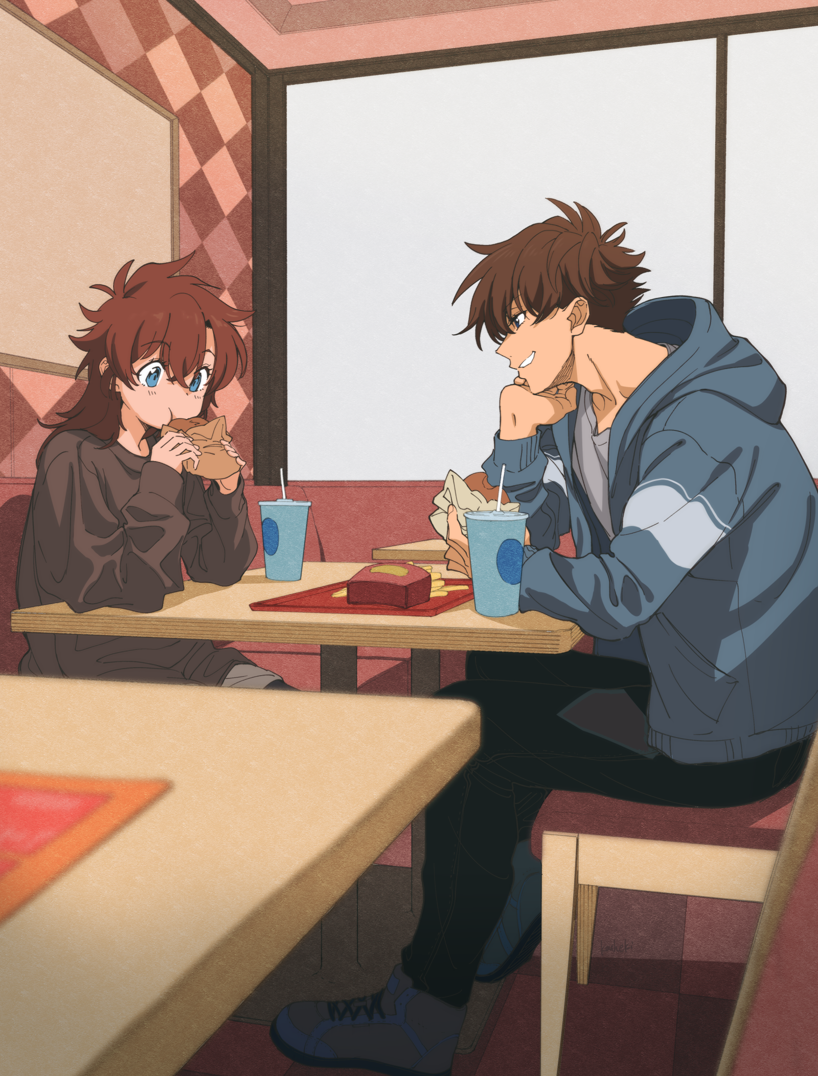 1boy 1girl black_pants blue_eyes blue_jacket blurry borokouhek brown_hair brown_shirt burger chair commentary_request couple cup depth_of_field disposable_cup drinking_straw eating food french_fries from_side hair_between_eyes hand_on_own_chin hetero highres holding holding_burger holding_food jacket kuroba_kaito long_sleeves looking_at_another looking_at_food magic_kaito medium_hair messy_hair nakamori_aoko on_chair open_mouth pants restaurant shirt shoes short_hair side_part sitting slice_of_life smirk sneakers table teeth tray white_shirt window
