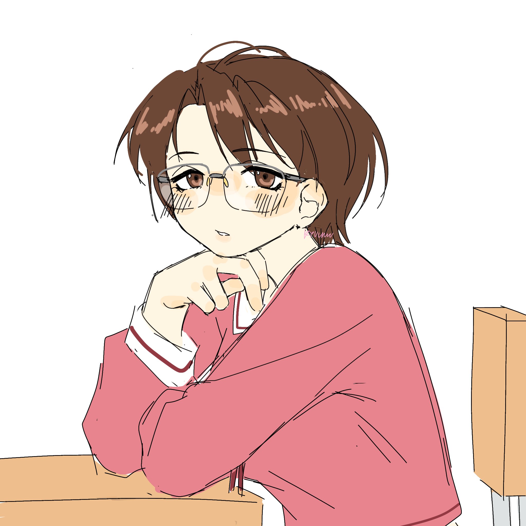 1girl alternate_hair_length alternate_hairstyle azumanga_daioh's_school_uniform azumanga_daiou brown_eyes brown_hair desk glasses hand_on_own_chin highres kyuunn long_sleeves looking_at_viewer mizuhara_koyomi pink_serafuku pink_shirt sailor_collar school_desk school_uniform serafuku shirt short_hair simple_background sitting twitter_username white_background white_sailor_collar