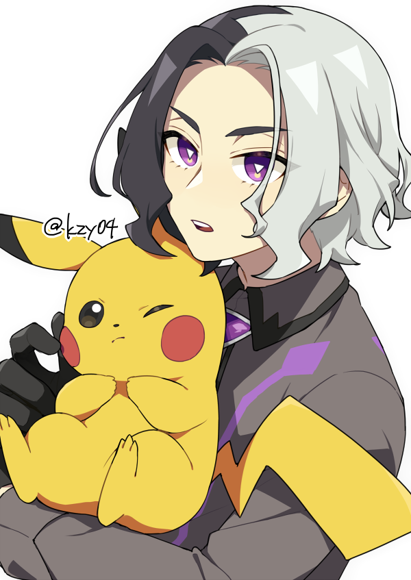 1boy amethio_(pokemon) black_hair brown_eyes carrying closed_mouth gen_1_pokemon male_focus multicolored_hair nintendo one_eye_closed pikachu pokemon pokemon_(anime) pokemon_(creature) pokemon_horizons purple_eyes two-tone_hair white_background white_hair yuita_ro