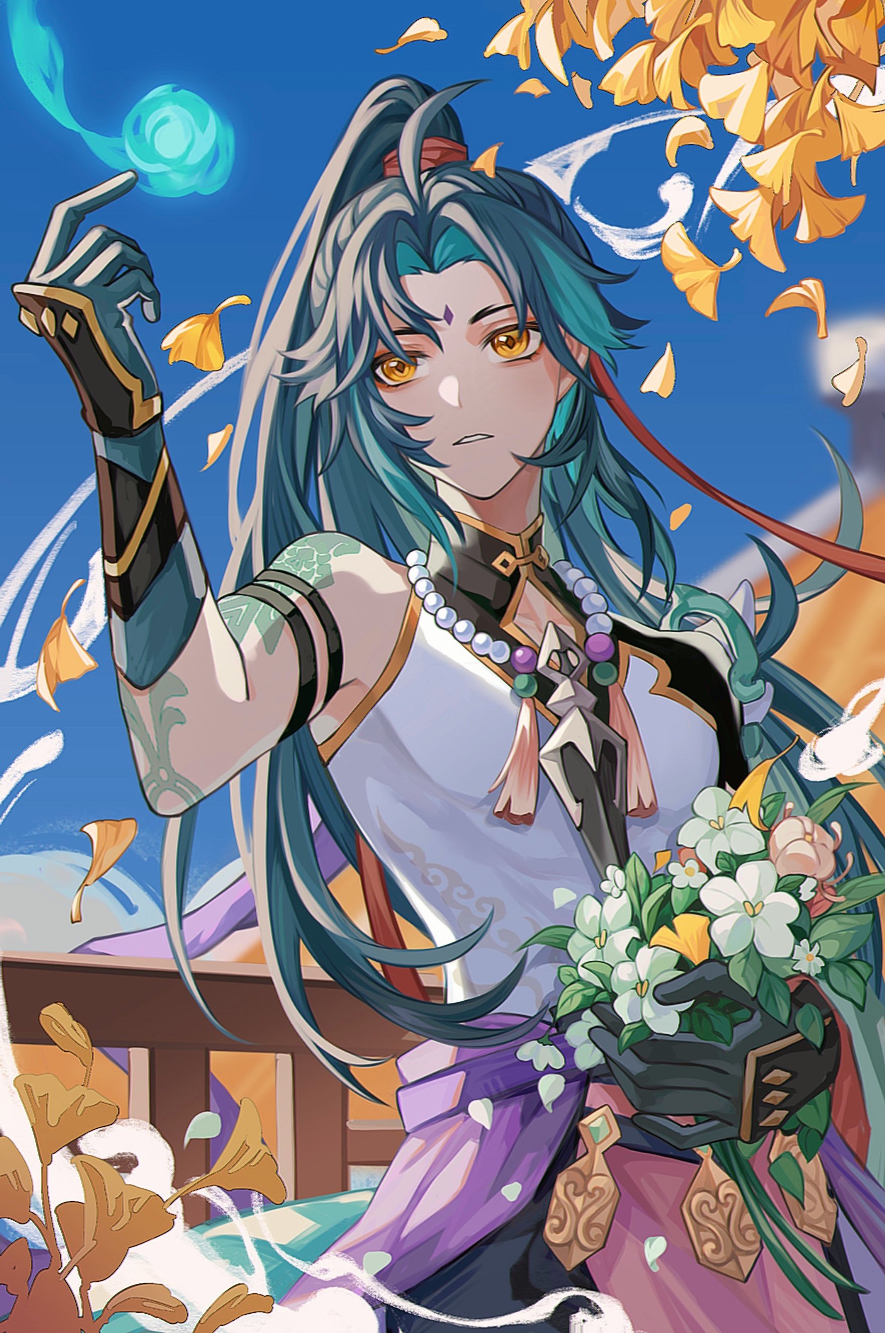 1boy above-cleavage_cutout absurdres against_railing alternate_hair_length alternate_hairstyle arm_up armlet blue_sky blurry blurry_background bouquet clothing_cutout commentary cowboy_shot curtained_hair diamond_(shape) diamond_cutout diamond_facial_mark facial_mark flower forehead_mark genshin_impact ginkgo_leaf hair_ribbon hand_on_own_stomach high_ponytail highres holding holding_bouquet jewelry leaf long_hair male_focus orb outdoors parted_lips petals ponytail railing red_ribbon ribbon skindentation sky solo standing untranslatable_commentary toned toned_male unik0503 wind xiao_(genshin_impact) yellow_leaves yellow_petals