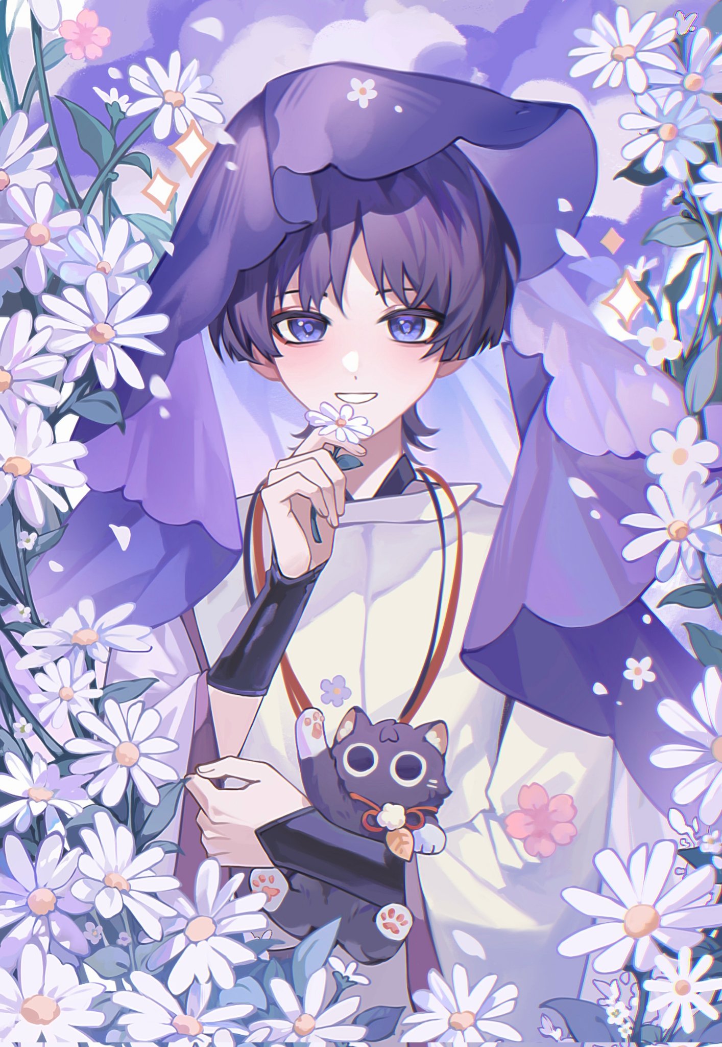 1boy animal baby_animal cat chromatic_aberration dot_nose falling_petals floral_border flower genshin_impact grin hand_up highres holding holding_animal holding_cat holding_flower jewelry kitten light_blush light_smile looking_at_viewer male_focus necklace petals purple_theme purple_veil scaramouche_(cat)_(genshin_impact) scaramouche_(genshin_impact) scaramouche_(kabukimono)_(genshin_impact) short_hair smile solo standing unik0503 upper_body veil white_petals wind