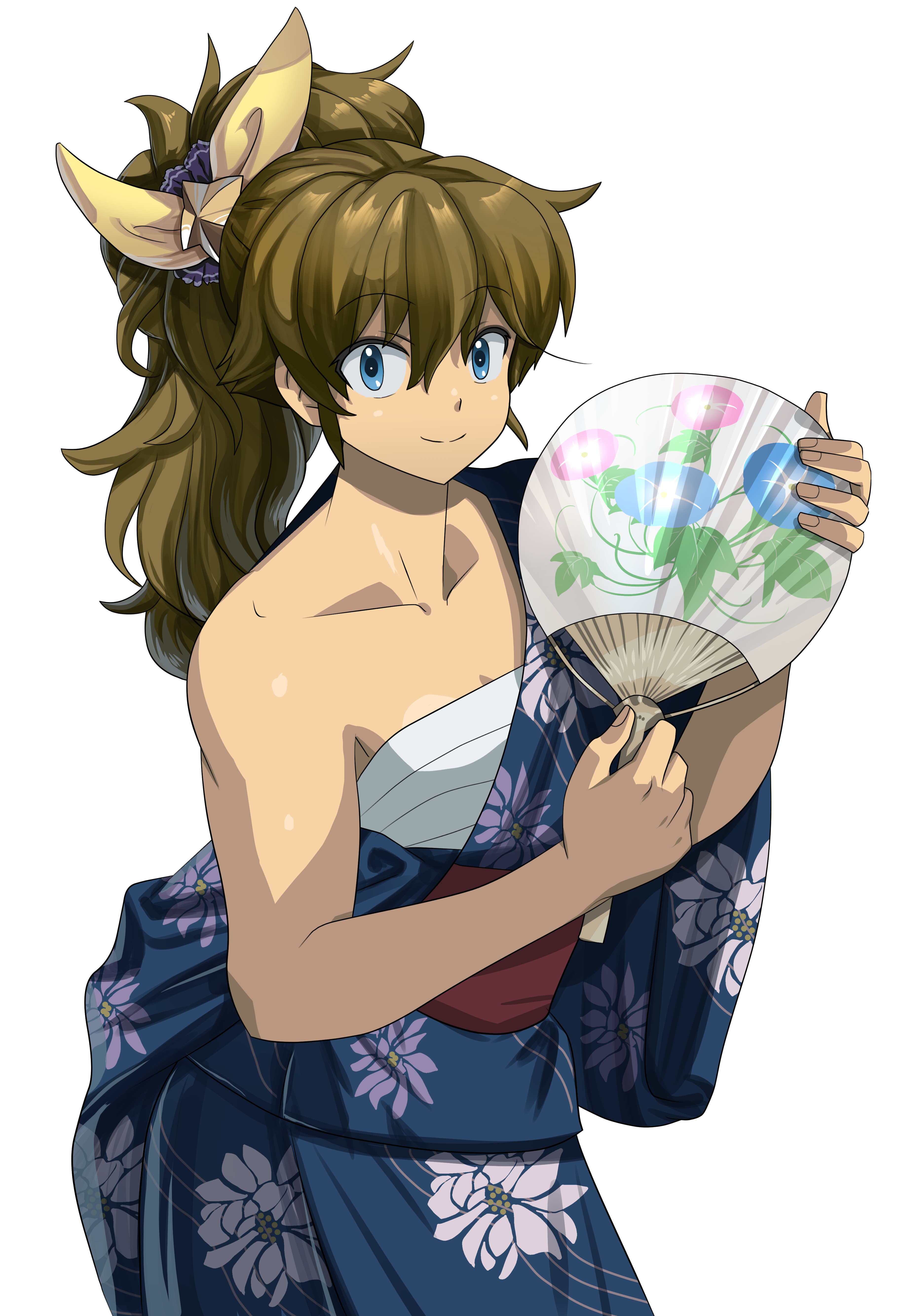 1girl absurdres blue_eyes blue_kimono bow bra brown_hair cowboy_shot floral_print floral_print_kimono hair_between_eyes hair_bow hair_ornament hand_fan highres holding japanese_clothes kimono long_hair m.u.g.e.n oggy_(oggyoggy) original paper_fan ponytail print_kimono ryuko_(oggyoggy) sarashi shiny_skin smile solo star_(symbol) star_hair_ornament transparent_background uchiwa underwear yellow_bow
