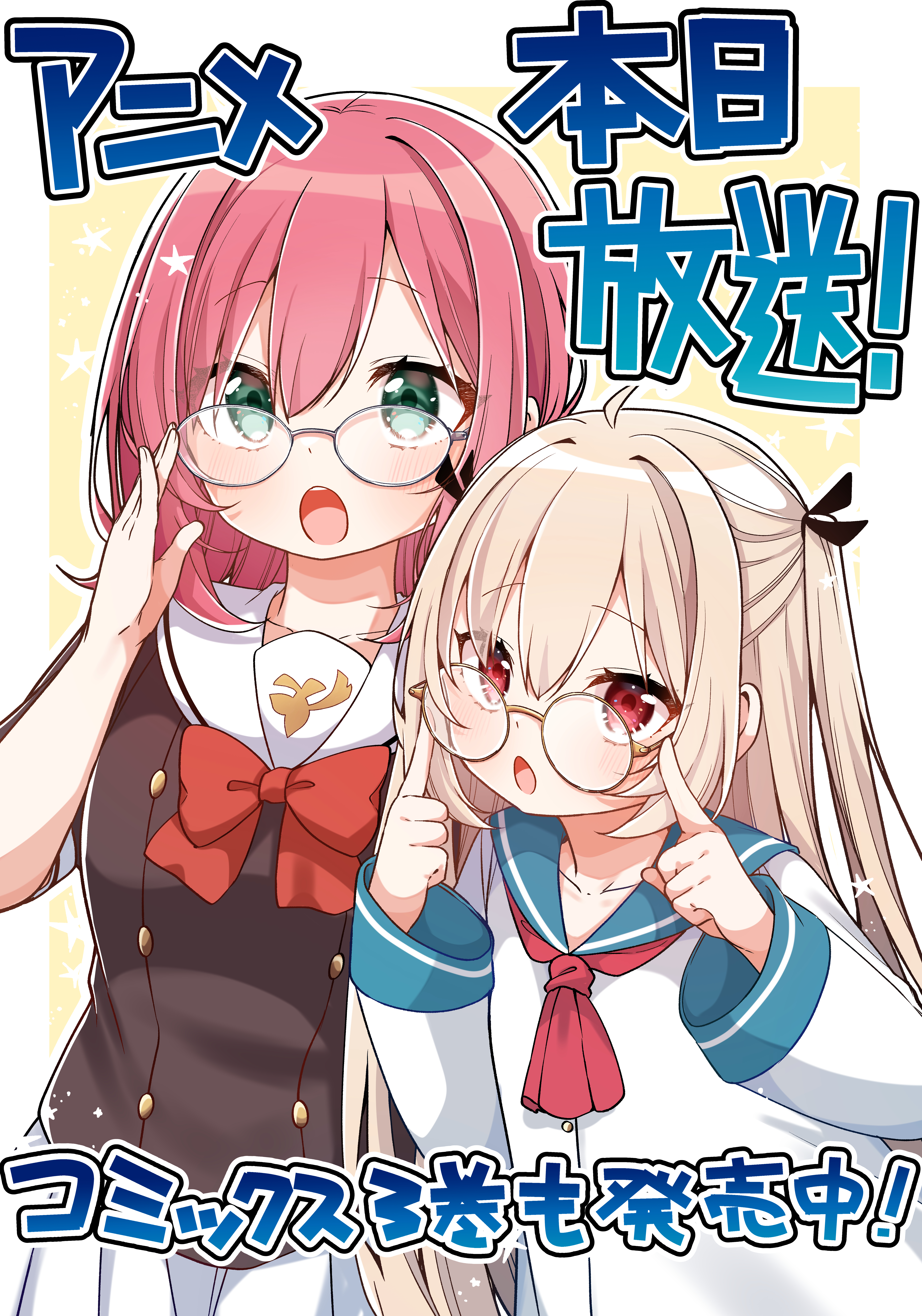 2girls :o absurdres atri atri-my_dear_moments- bespectacled black_ribbon black_shirt blue_sailor_collar bow brown_hair collarbone commentary_request dress glasses green_eyes hair_between_eyes hair_ribbon highres jako_(jakoo21) kamishiro_minamo long_hair long_sleeves looking_at_viewer multiple_girls open_mouth pink_hair pleated_skirt red_bow red_eyes ribbon round_eyewear sailor_collar sailor_dress shirt skirt sleeves_past_wrists translation_request two_side_up very_long_hair white_dress white_sailor_collar white_skirt