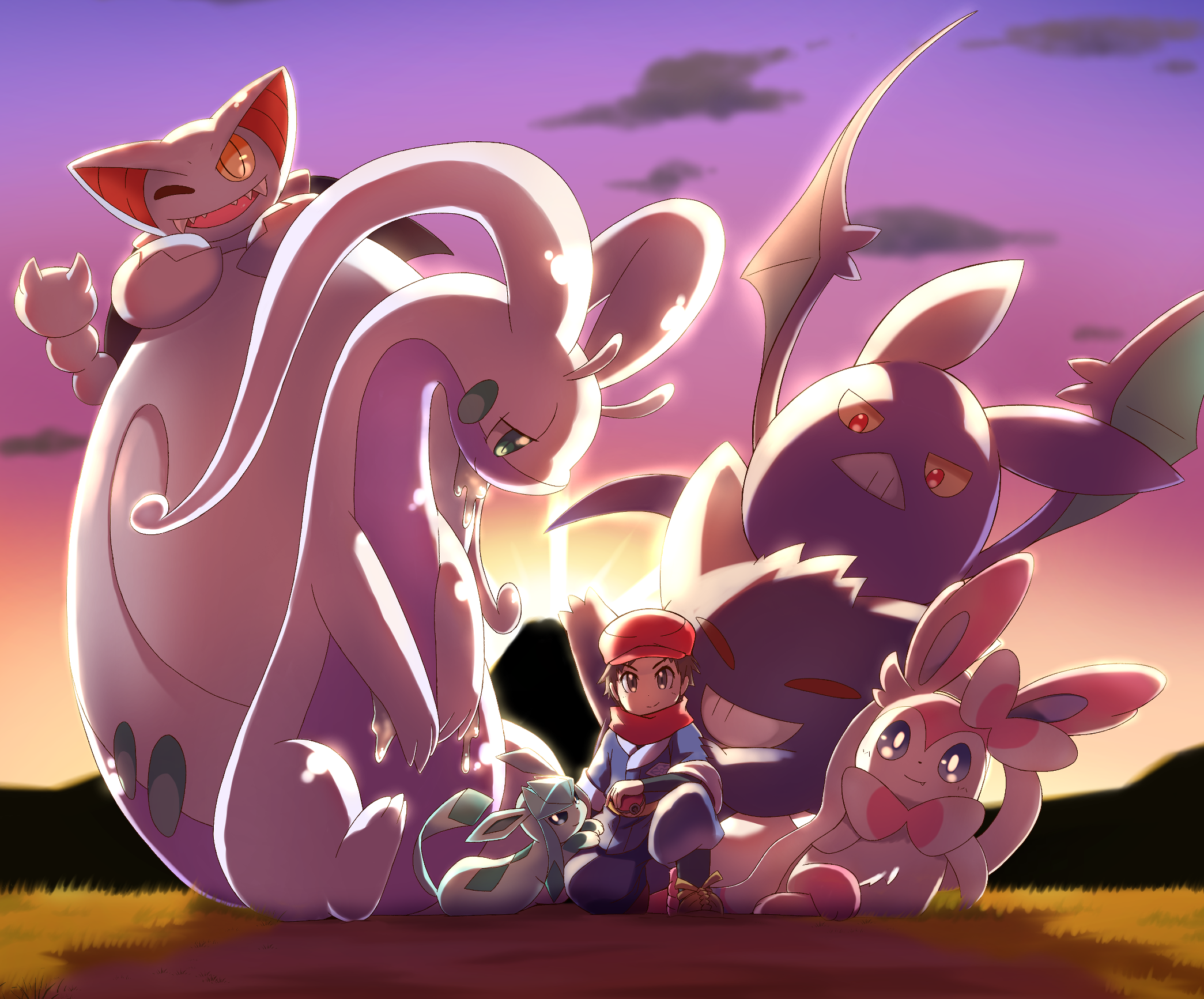 1boy brown_eyes brown_hair cloud crobat gen_1_pokemon gen_2_pokemon gen_4_pokemon gen_6_pokemon gengar glaceon gliscor grass hat highres hisuian_goodra mountainous_horizon neoyorimi2 nintendo poke_ball pokemon pokemon_(creature) pokemon_legends:_arceus red_hat red_scarf rei_(pokemon) scarf shadow sky smile sunset sylveon