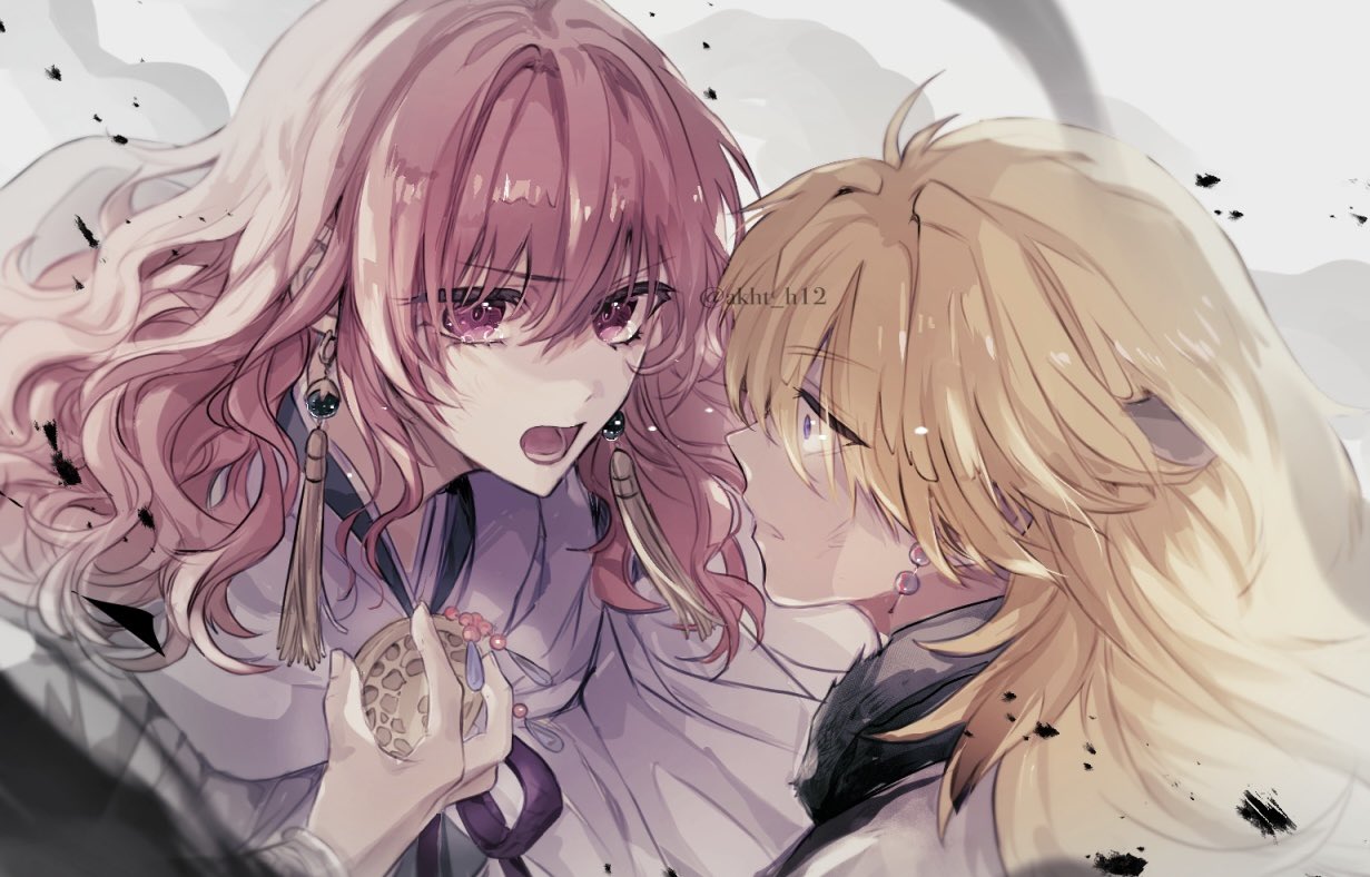 1boy 1girl akatsuki_no_yona akehata_hikari blonde_hair cape commentary earrings fur_trim hood hooded_cape jewelry long_hair medium_hair open_mouth purple_eyes red_hair tassel tassel_earrings wide-eyed yona_(akatsuki_no_yona) zeno_(akatsuki_no_yona)