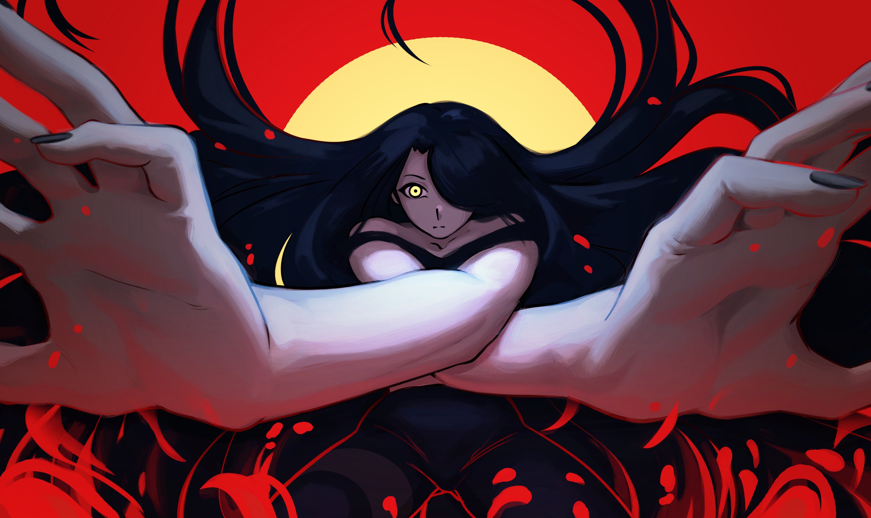 1girl black_hair black_nails closed_mouth commentary crossed_arms foreshortening hair_over_one_eye highres long_hair nila_(telepurte) off_shoulder original outstretched_arms reaching reaching_towards_viewer red_background solo split_mouth straight_hair telepurte two-tone_background very_long_hair yellow_background yellow_eyes