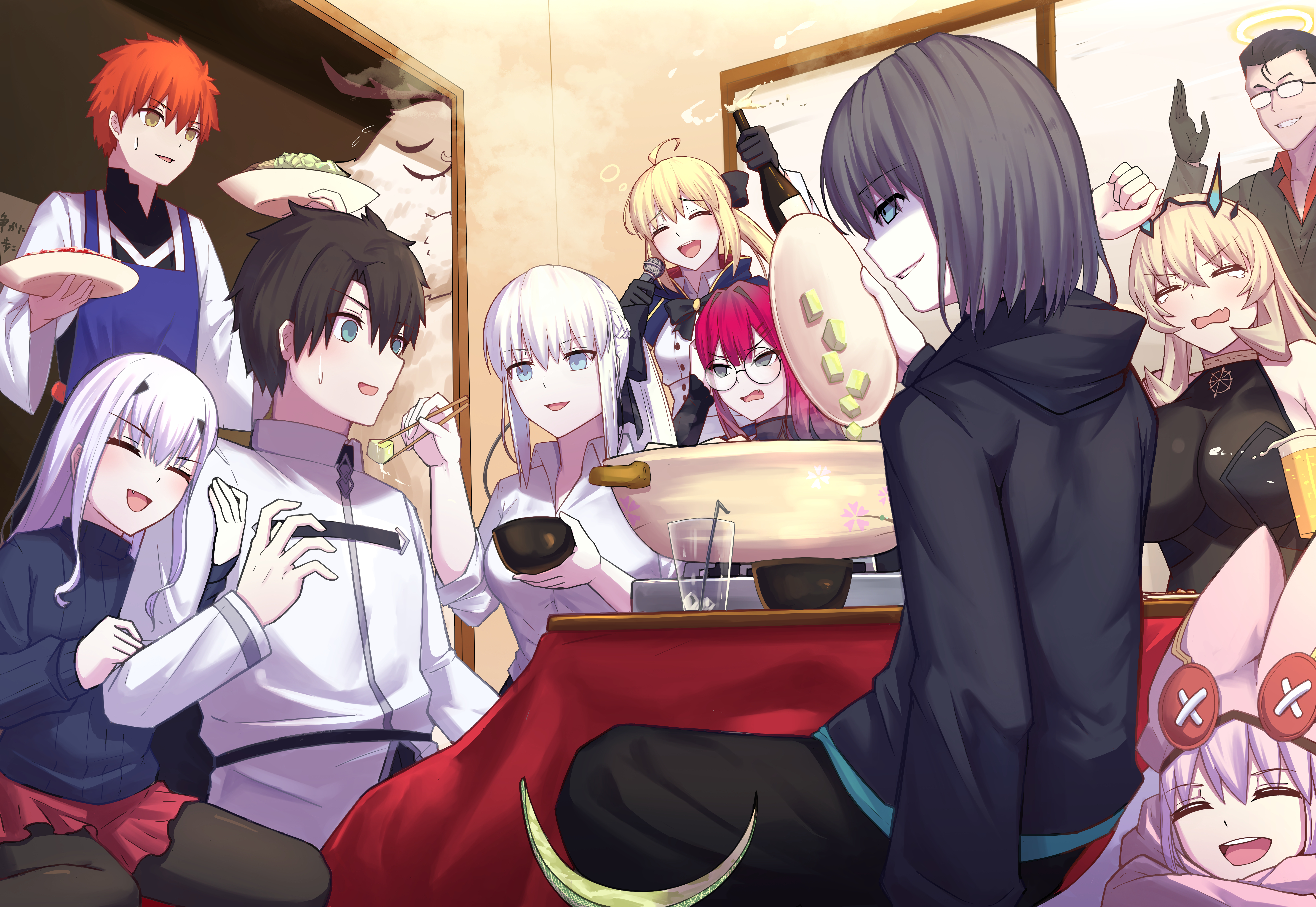 4boys 6+girls absurdres apron arm_hug artoria_caster_(fate) artoria_caster_(second_ascension)_(fate) artoria_pendragon_(fate) baobhan_sith_(fate) baobhan_sith_(swimsuit_pretender)_(second_ascension)_(fate) barghest_(fate) barghest_(second_ascension)_(fate) beryl_gut black_gloves black_hair black_hoodie blonde_hair blue_apron blue_eyes blue_sweater blush bottle bowl breasts cernunnos_(fate) chopsticks closed_mouth emiya_shirou eyeshadow fang fate/grand_order fate_(series) feeding fujimaru_ritsuka_(male) ghost glasses gloves grey_eyes grey_hair habetrot_(fate) hair_ribbon halo hat highres holding holding_bottle holding_bowl holding_plate hood hoodie kotatsu large_breasts long_hair makeup melusine_(fate) microphone morgan_le_fay_(chaldea_satellite_station)_(fate) morgan_le_fay_(fate) multiple_boys multiple_girls natu_zame oberon_(fate) oberon_(moody_summer_oberon)_(fate) oberon_(third_ascension)_(fate) office_lady open_mouth orange_hair pink_hair pink_hat plate ponytail ribbon round_eyewear senji_muramasa_(fate) senji_muramasa_(second_ascension)_(fate) shirt short_hair sidelocks sitting smile sweat sweater table tearing_up twintails wavy_mouth white_hair white_shirt yellow_eyes