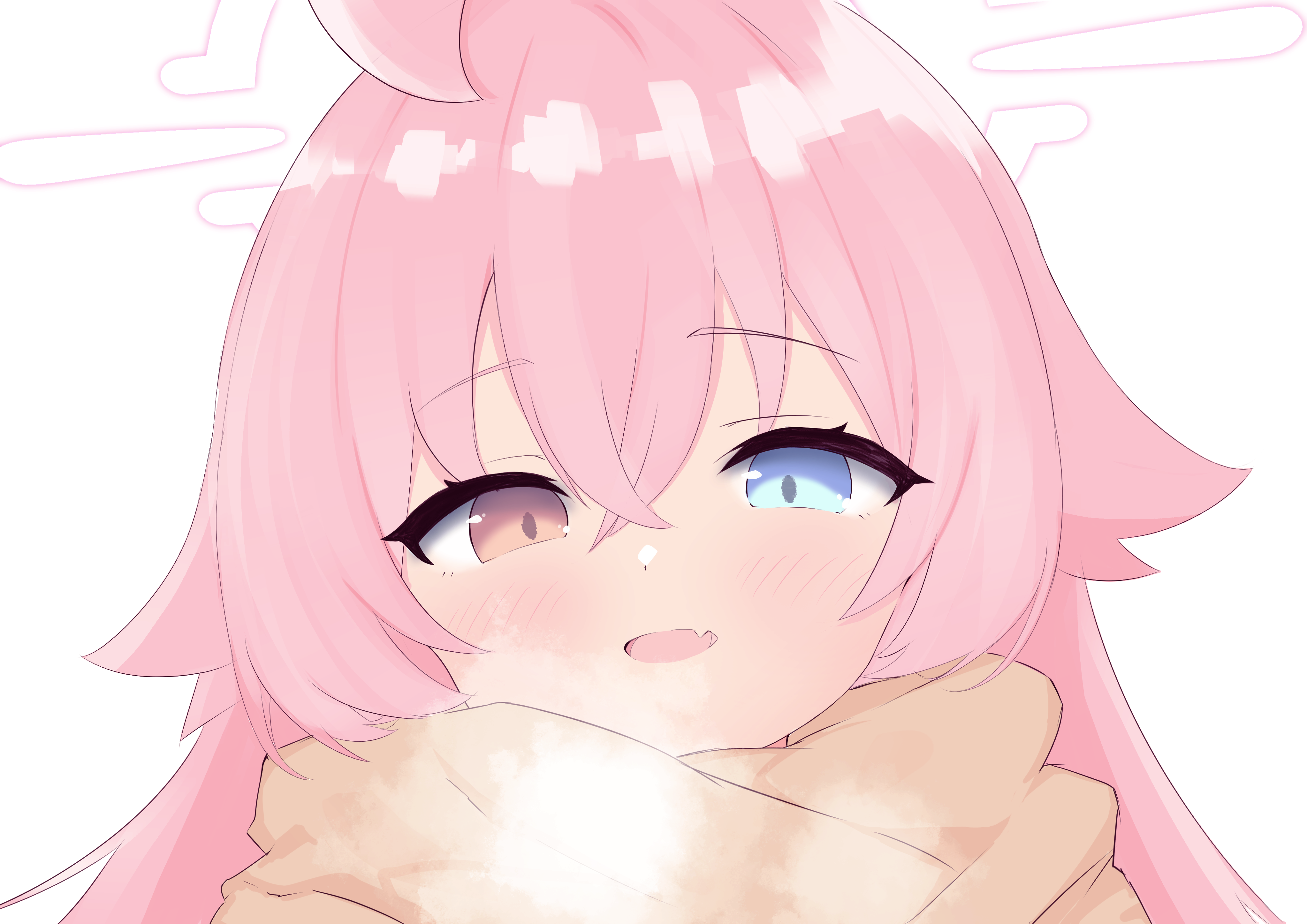 1girl absurdres ahoge blue_archive blue_eyes blush breath brown_scarf crossed_bangs fang hair_between_eyes halo heterochromia highres hoshino_(blue_archive) ks_aya_(gztm4838) long_hair looking_at_viewer open_mouth pink_hair pink_halo portrait pov scarf simple_background skin_fang smile solo white_background yellow_eyes