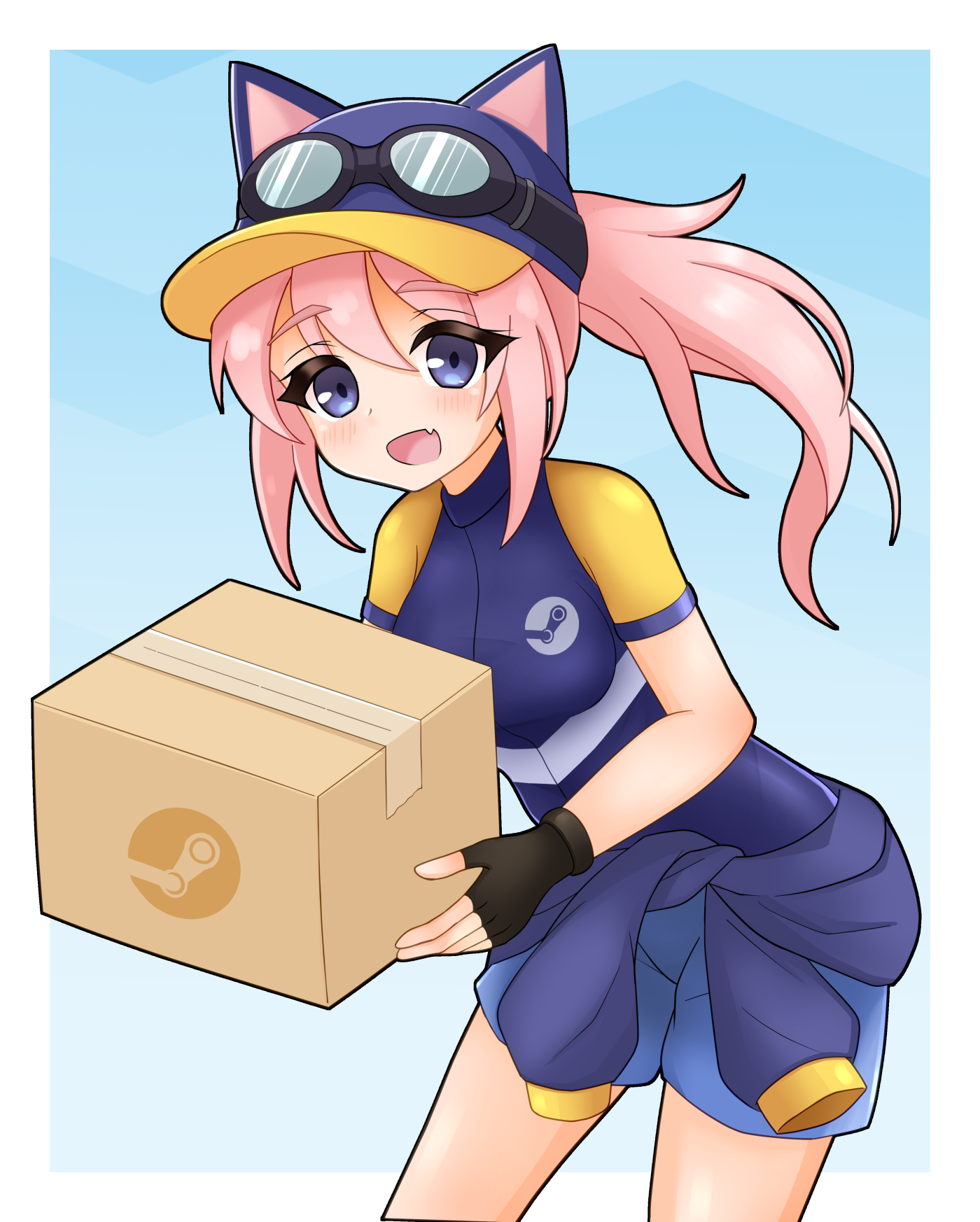 1girl animal_ear_headwear animal_hat baseball_cap black_gloves blue_background blue_eyes blue_jacket blue_shorts border box cat_hat clothes_around_waist dashimoro fake_animal_ears fang fingerless_gloves gloves goggles goggles_on_headwear gradient_background hat highres holding holding_box jacket light_blush long_hair looking_at_viewer open_mouth pink_hair ponytail shirt shirt_around_waist short_sleeves shorts sidelocks skin_fang smile solo steam_(platform) steam_delivery_girl white_background white_border