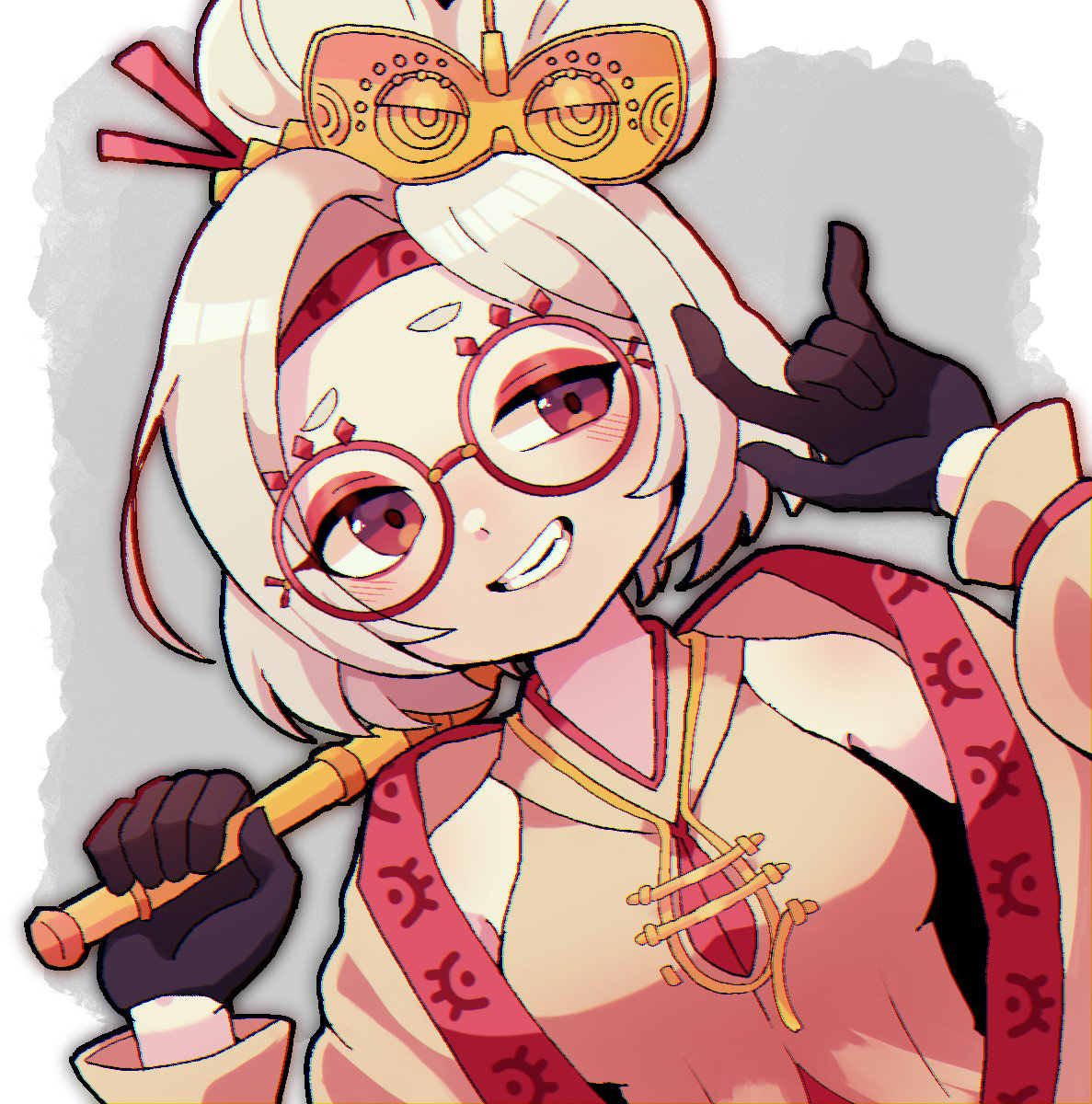 1girl black_gloves blush breasts eyeshadow glasses gloves grin highres looking_at_viewer makeup marimoko12 nintendo parted_lips purah red-framed_eyewear red_eyes red_eyeshadow round_eyewear short_hair small_breasts smile solo teeth the_legend_of_zelda the_legend_of_zelda:_tears_of_the_kingdom upper_body white_hair
