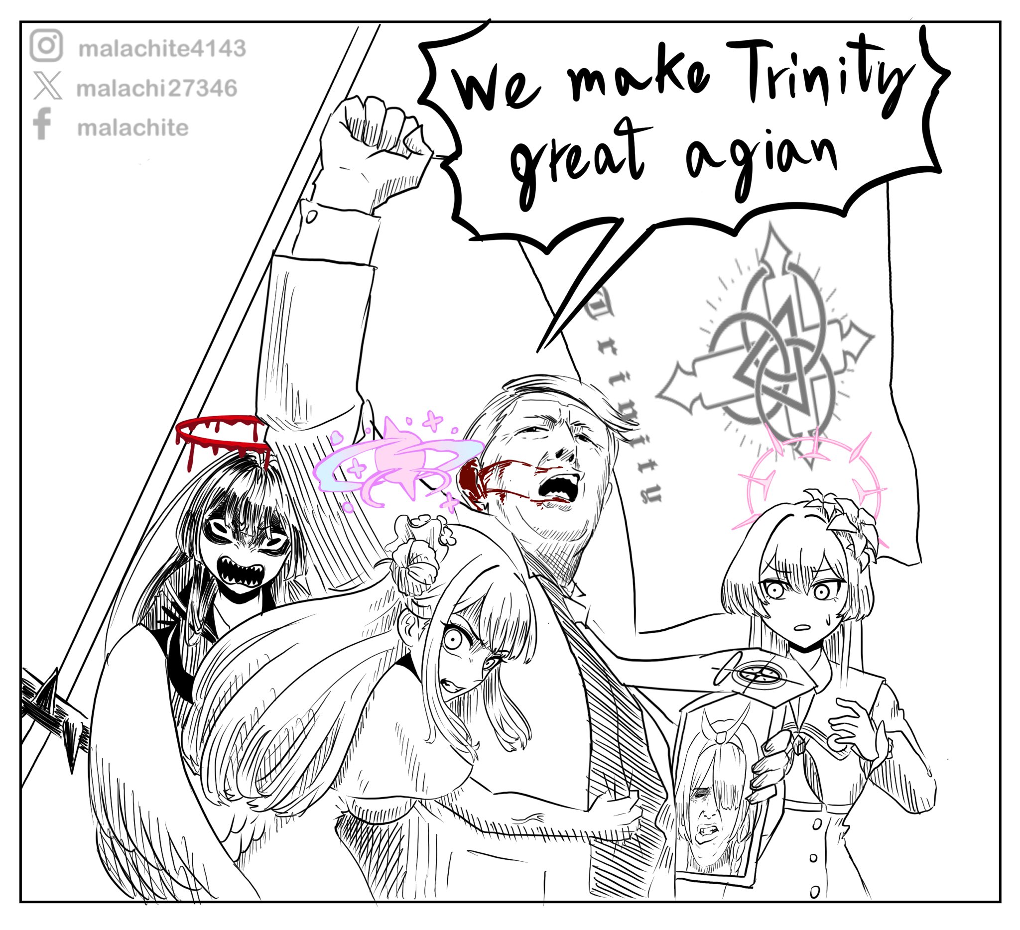 1boy 2024_attempted_assassination_of_donald_trump 3girls angel_wings angry arm_up arona_(blue_archive) blood blood_halo blue_archive donald_trump english_text flag formal_clothes hairband halo highres injury ipad liquid_halo long_sleeves looking_at_another make_america_great_again malachite_27346 meme mika_(blue_archive) multiple_girls nagisa_(blue_archive) necktie open_mouth parody politics real_life scene_reference sharp_teeth shirt sidelocks sketch suit tablet_pc teeth tsurugi_(blue_archive) watermark white_background wings