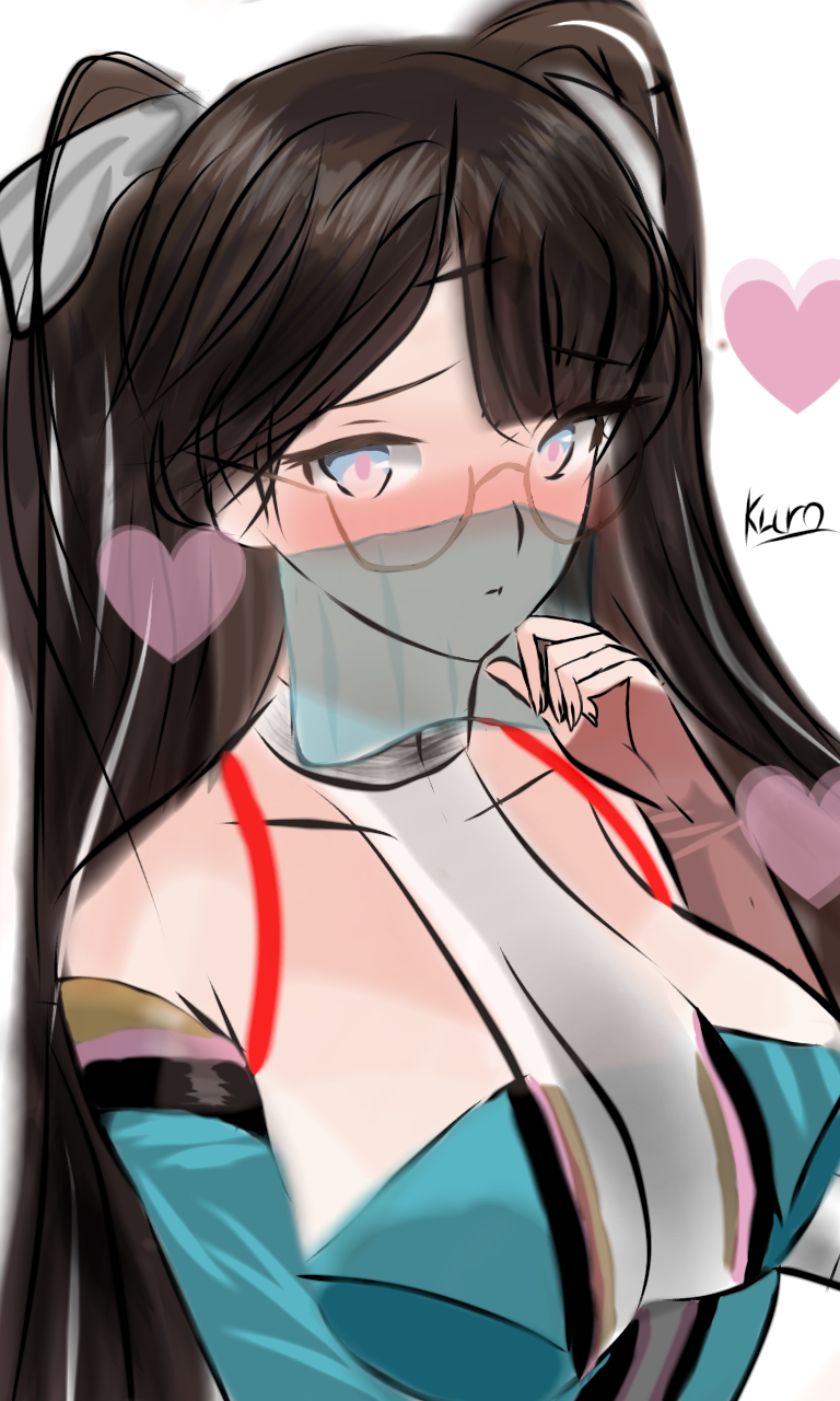 1girl aqua_dress blush bow breasts collarbone dress glasses hair_bow heart highres kurogami_fuyuki large_breasts long_hair looking_at_viewer mouth_veil multicolored_eyes multicolored_hair pink_pupils semi-rimless_eyewear solo twintails upper_body veil wuthering_waves yellow-framed_eyewear zhezhi_(wuthering_waves)