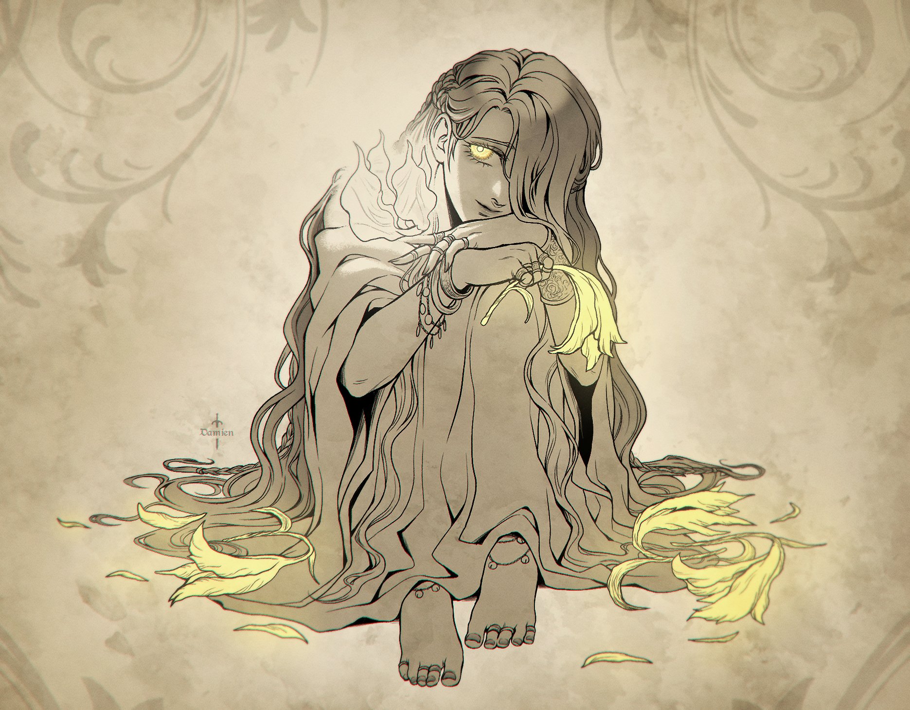 1boy androgynous barefoot closed_mouth damien_v_grimm elden_ring feet flower glowing glowing_eyes glowing_flower hair_over_one_eye hands_on_own_knees highres knees_up long_hair looking_at_viewer male_focus miquella_(elden_ring) sepia simple_background smile solo toenails toes wavy_hair yellow_eyes