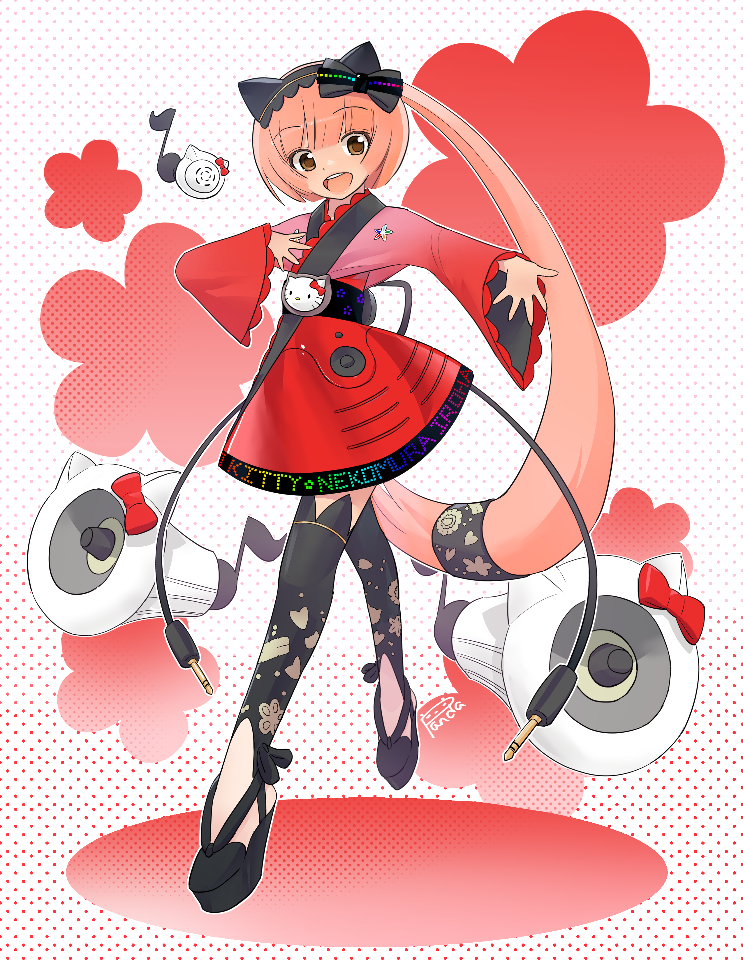 1girl absurdres alternate_universe animal_ear_hairband animal_ears audio_jack blunt_bangs bow brown_eyes cat_ear_hairband cat_ears commentary dress english_commentary english_text fake_animal_ears full_body hairband hand_on_own_chest hello_kitty hello_kitty_to_issho! highres long_hair looking_to_the_side low-tied_long_hair nekomura_iroha open_mouth panda_doodles pink_hair red_bow red_dress sanrio solo speaker synthesizer_v tail teeth upper_teeth_only very_long_hair vocaloid wide_sleeves