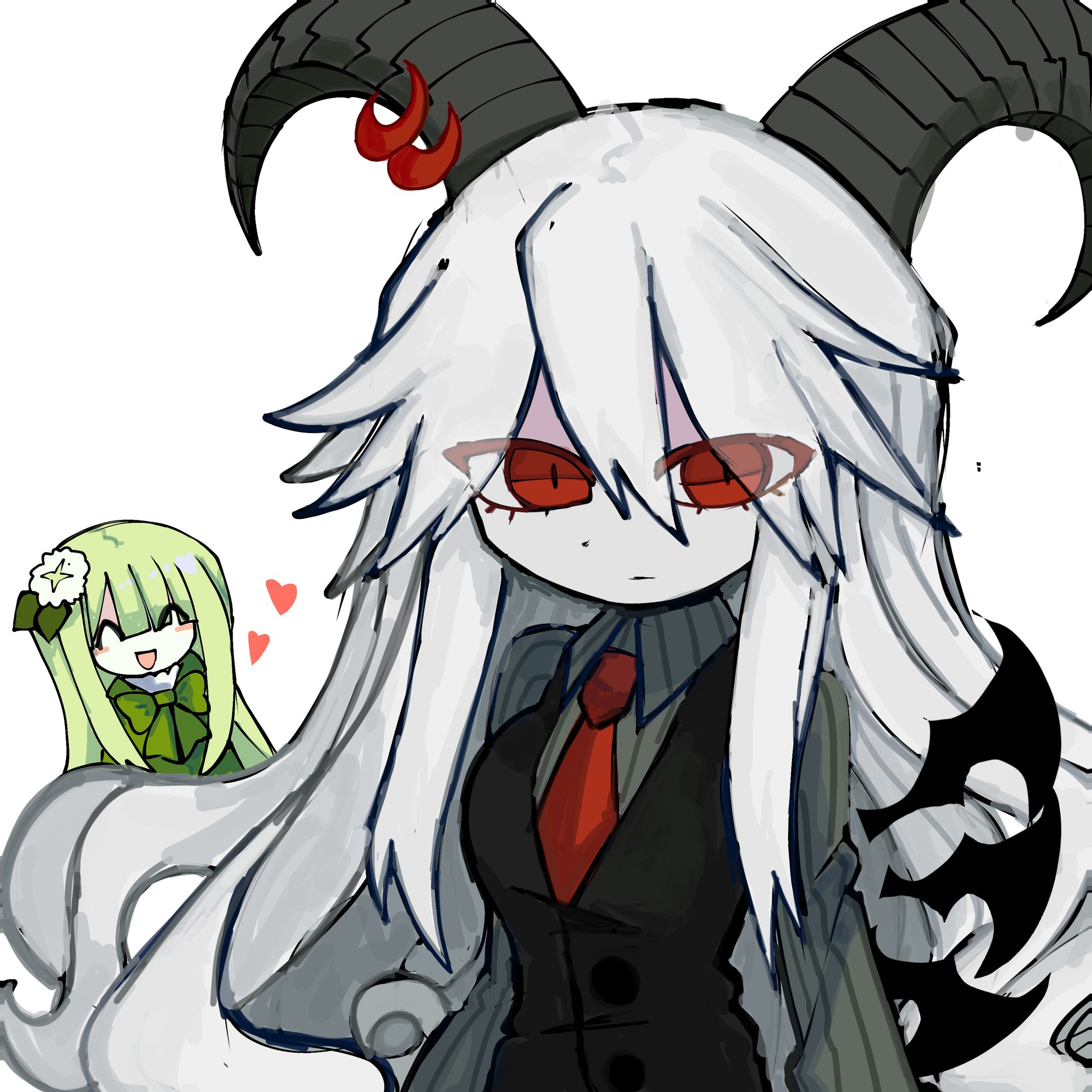 2girls ^_^ bow bowtie closed_eyes collared_shirt demon_horns double-parted_bangs flower funamusea green_bow green_bowtie green_hair hair_flower hair_ornament heart highres horn_piercing horns long_hair multiple_girls necktie red_eyes red_necktie reficul_(funamusea) sam_(sillylinariafan) shirt sidelocks simple_background sin_(funamusea) solo_focus sweater_vest white_hair wife_and_wife wings