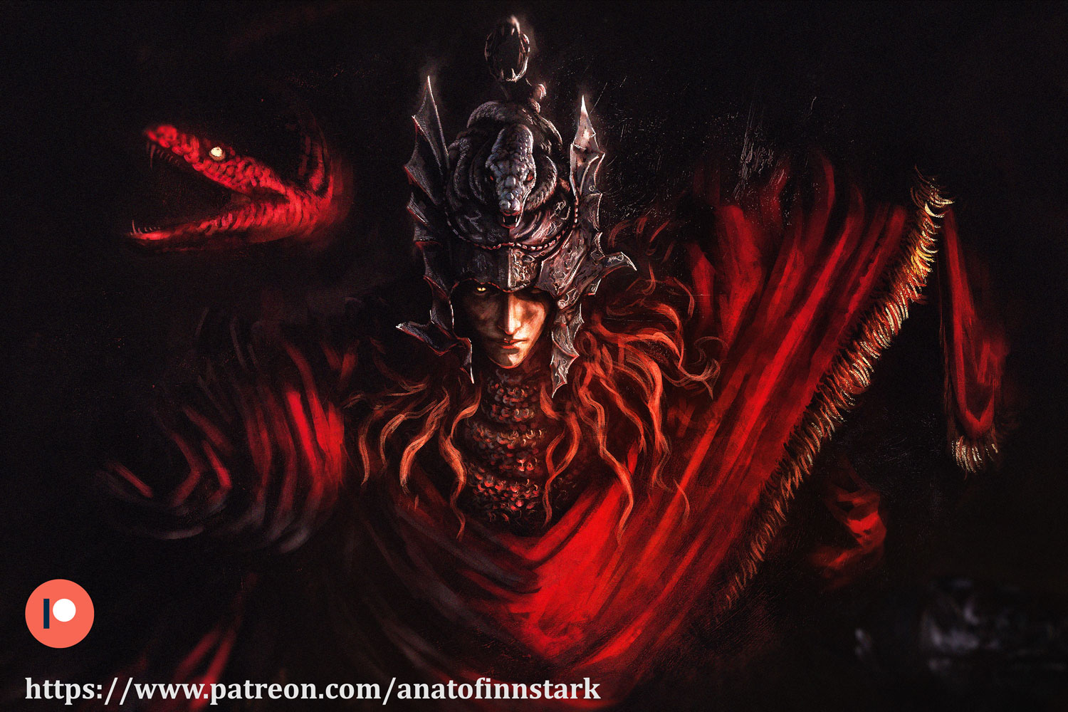 1boy anato_finnstark armor black_snake chainmail elden_ring elden_ring:_shadow_of_the_erdtree helmet long_hair looking_at_viewer messmer_the_impaler one_eye_closed ornate ornate_armor patreon_logo patreon_username red_hair red_robe red_snake robe slit_pupils snake snake_on_shoulder solo watermark web_address winged_helmet yellow_eyes