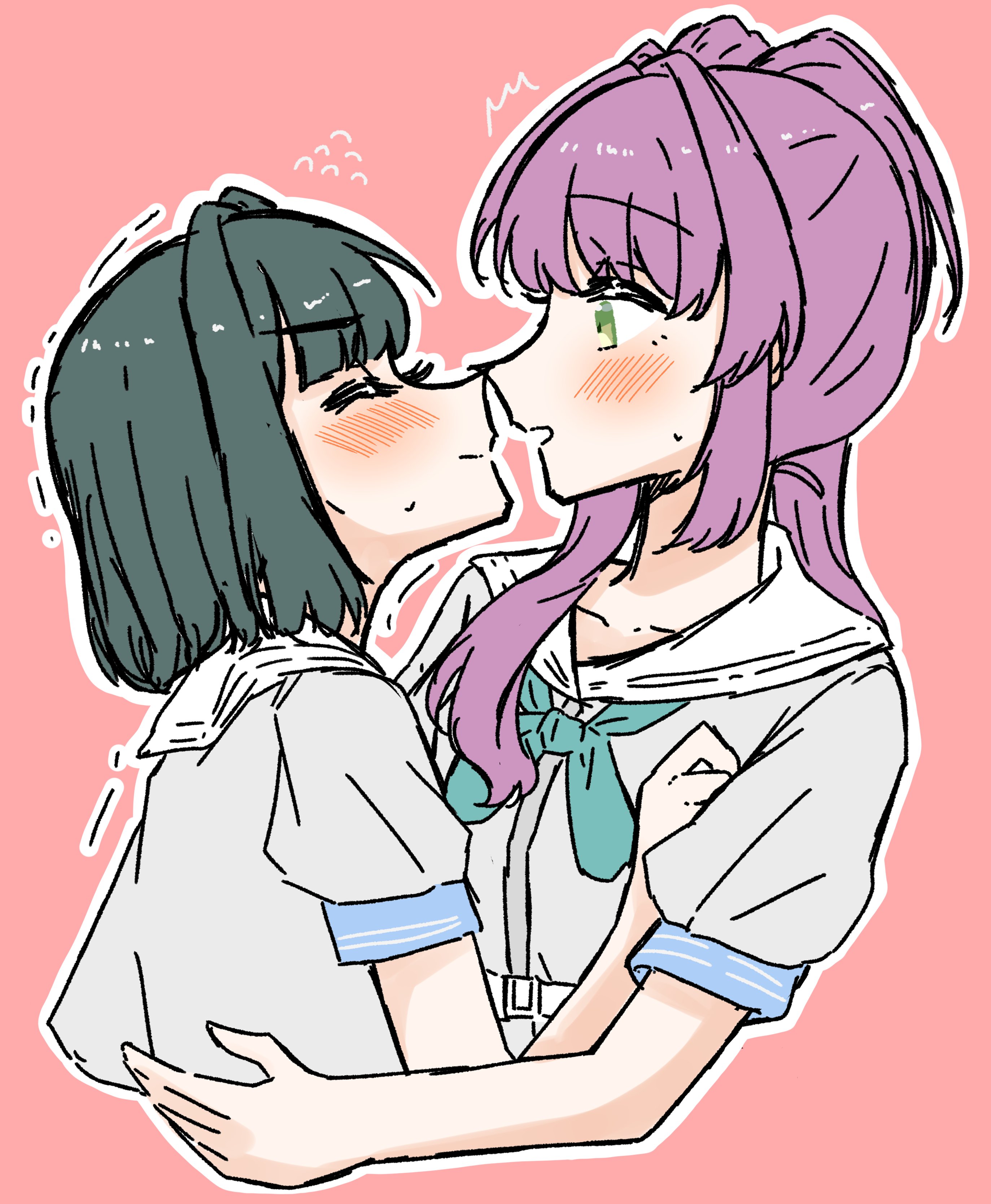 2girls ^^^ absurdres aqua_neckerchief black_hair blunt_bangs blunt_ends blush bob_cut closed_eyes closed_mouth commentary dress flying_sweatdrops green_eyes grey_dress hair_bun hasu_no_sora_school_uniform highres imminent_kiss link!_like!_love_live! long_hair love_live! momose_ginko multiple_girls neckerchief noses_touching open_mouth otomune_kozue outline pink_background puffy_short_sleeves puffy_sleeves puripuri_hurai purple_hair sailor_collar sailor_dress school_uniform short_hair short_sleeves side_ponytail sidelocks single_side_bun summer_uniform sweatdrop upper_body virtual_youtuber white_outline white_sailor_collar yuri
