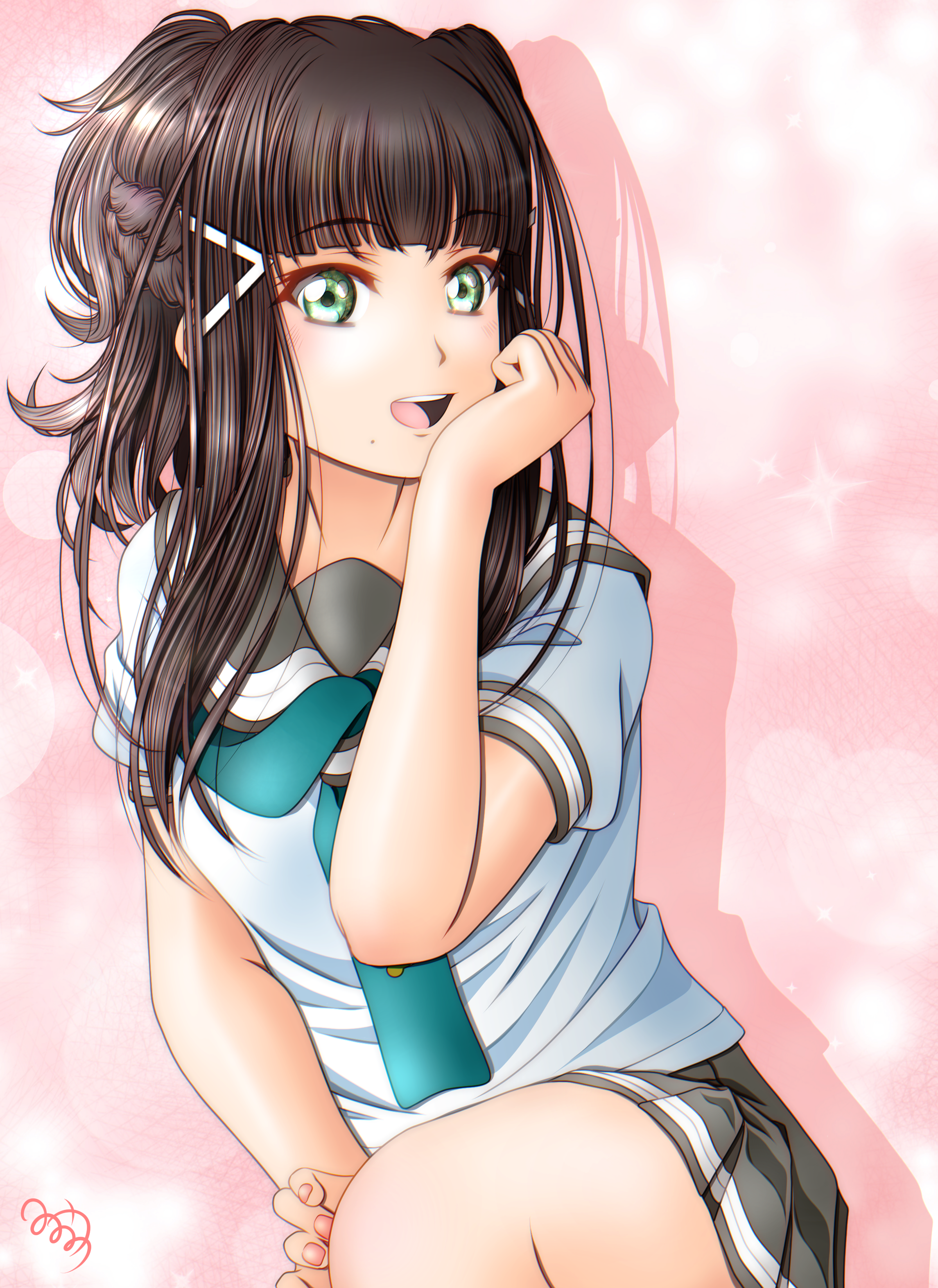 1girl absurdres alternate_hairstyle aqua_eyes brown_hair highres kurosawa_dia long_hair looking_at_viewer love_live! love_live!_sunshine!! minami_saan short_sleeves smile uranohoshi_school_uniform