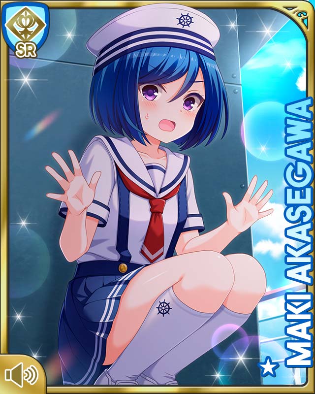 1girl akasegawa_maki blue_hair blue_skirt card character_name girlfriend_(kari) hat looking_at_viewer necktie ocean official_art open_mouth outdoors purple_eyes qp:flapper red_necktie sailor_collar sailor_hat ship shirt short_hair sitting skirt socks subspenders surprised tagme watercraft white_shirt white_socks