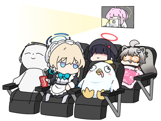 1boy 4girls ahoge animal_ear_fluff animal_ears apron bendy_straw beret black_dress black_hair black_hat blonde_hair blue_archive blue_eyes chibi closed_eyes closed_mouth commentary_request cup disposable_cup doodle_sensei_(blue_archive) dress drinking_straw frilled_apron frills grey_hair hair_between_eyes hair_over_eyes halo hat holding holding_cup jitome juliet_sleeves justice_task_force_member_(blue_archive) kaya_(blue_archive) long_sleeves maid maid_apron michiru_(blue_archive) mob_cap multiple_girls nyaru_(nyaru_4126) open_mouth peroro_(blue_archive) pink_hair puffy_sleeves raccoon_ears raccoon_hair_ornament sensei_(blue_archive) stuffed_animal stuffed_penguin stuffed_toy toki_(blue_archive) tongue tongue_out twintails white_apron white_background white_hat