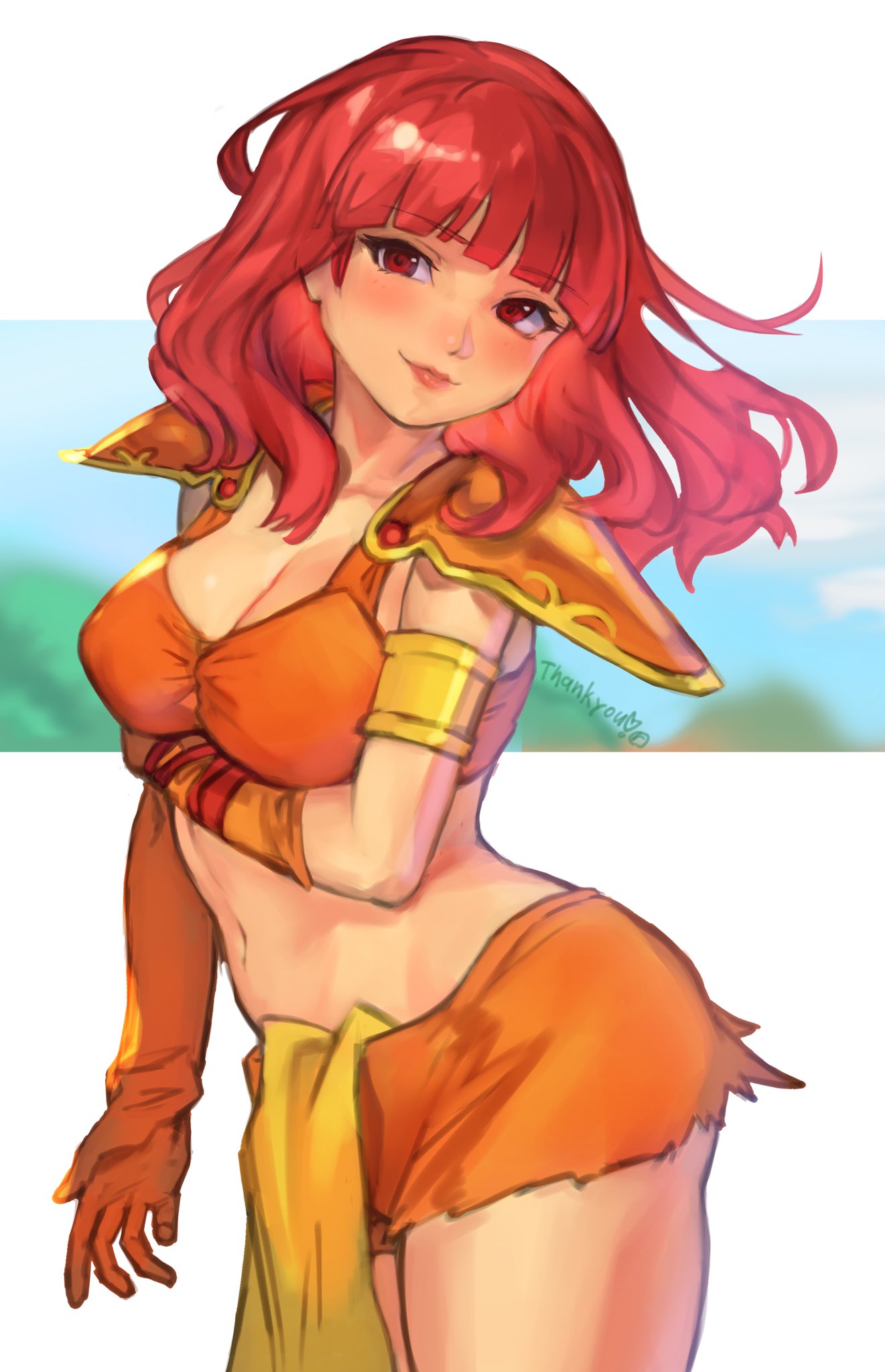 1girl armlet armor breasts celica_(fire_emblem) cleavage crop_top cutoffs fire_emblem fire_emblem_echoes:_shadows_of_valentia fire_emblem_gaiden gloves highres jewelry loincloth looking_at_viewer midriff nintendo official_alternate_costume orange_shorts r123 red_eyes red_hair short_shorts shorts shoulder_armor solo thighs