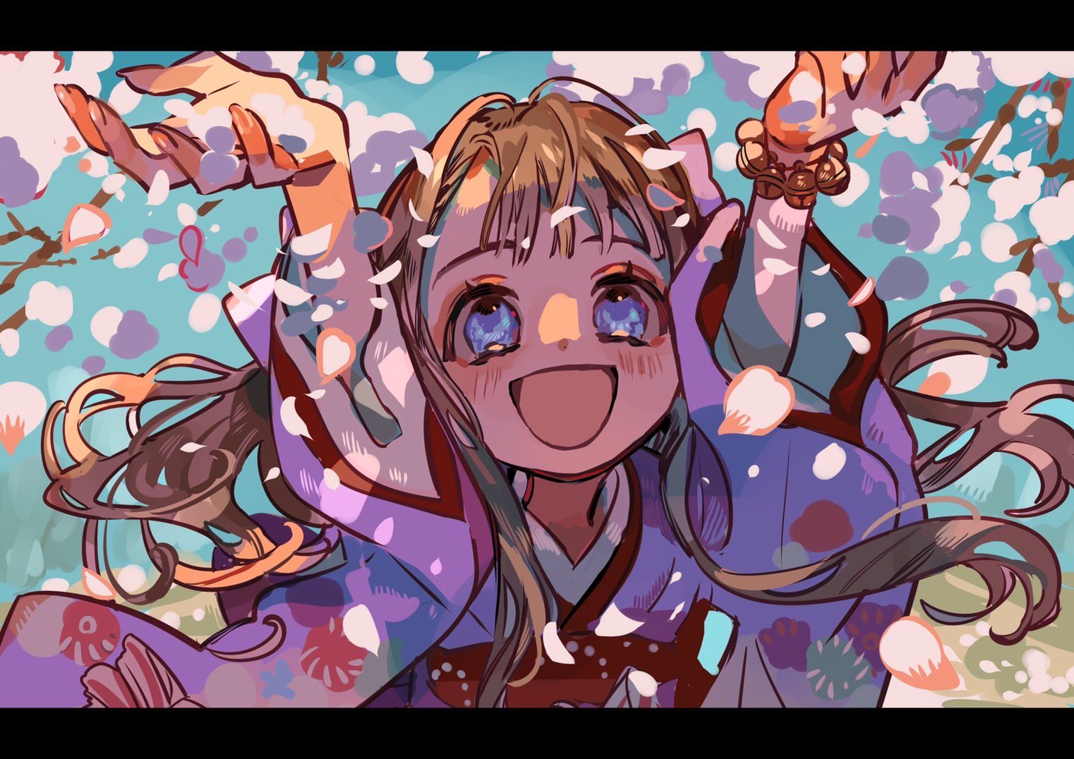 1girl :d antenna_hair arms_up bell blue_eyes blunt_bangs branch dappled_sunlight day facing_viewer falling_petals fingernails furisode grass hanoyuta happy holding holding_petal japanese_clothes jibaku_shounen_hanako-kun jingle_bell kimono leaning_forward letterboxed light_blush light_brown_hair long_fingernails long_hair looking_ahead official_art open_hands open_mouth outdoors parted_hair petals portrait red_sash red_trim sash sketch_background smile solo sumire_(jibaku_shounen_hanako-kun) sunlight unkempt very_long_hair white_petals wind
