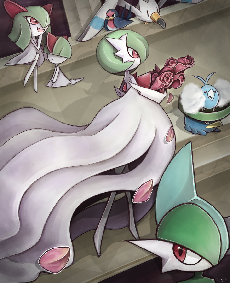 bob_cut bouquet dress falling_petals flower gallade gardevoir gen_3_pokemon gen_4_pokemon green_hair hair_over_eyes hair_over_one_eye holding holding_bouquet horns kirlia lotad mega_gardevoir mega_pokemon nintendo no_feet petals pink_eyes pokemon pokemon_(creature) ralts rose sidelocks swablu taillow white_dress wingull ziryuu