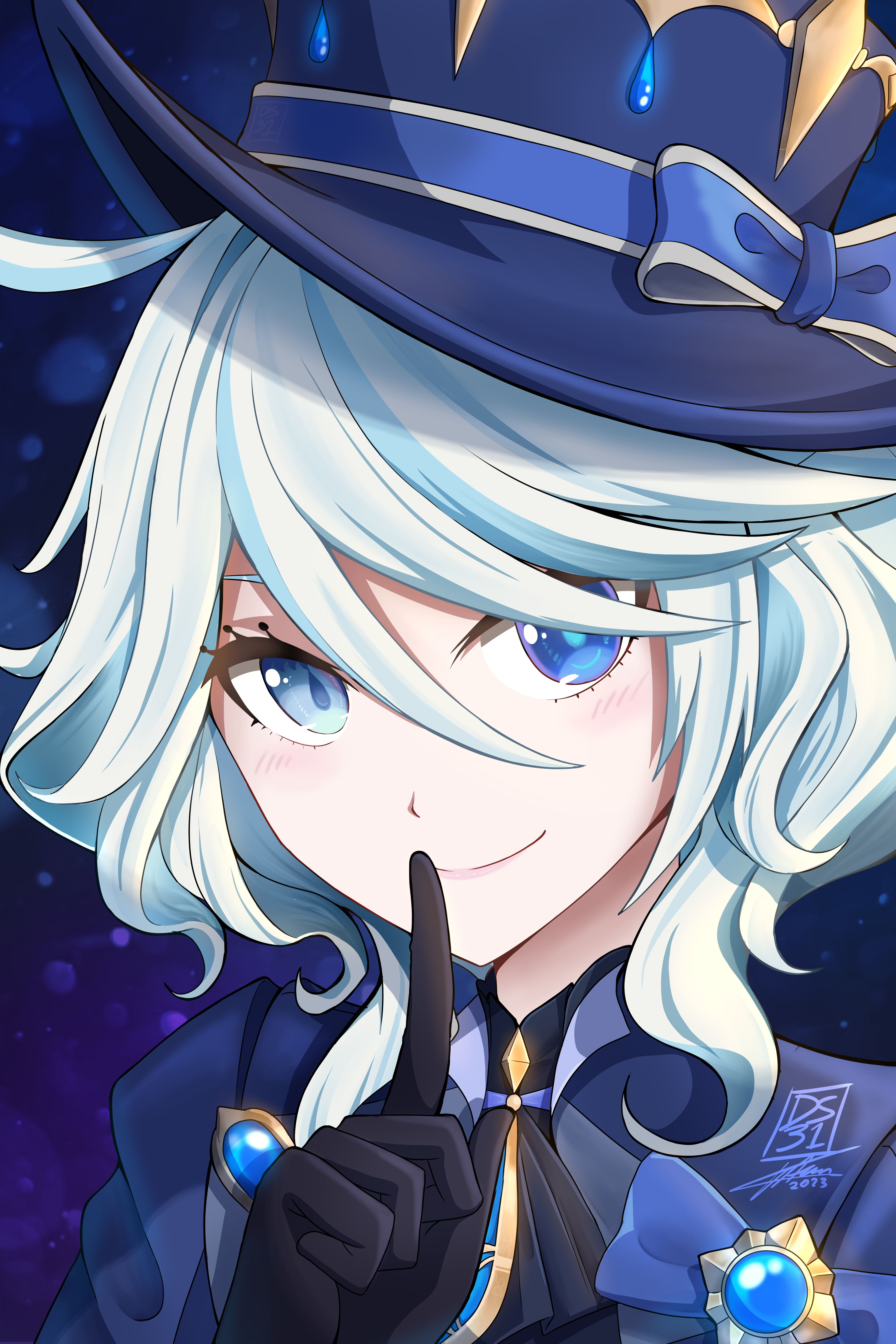 1girl absurdres amulet black_gloves blue_eyes blue_gem blue_hair blush bow darkstar31 finger_to_mouth furina_(genshin_impact) gem genshin_impact gloves hat heterochromia highres medium_hair portrait shushing top_hat