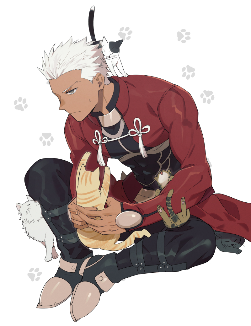 1boy animal archer_(fate) cape cat chinese_knot dark-skinned_male dark_skin fate/stay_night fate_(series) grey_eyes holding holding_animal holding_cat ichimatsuinfo male_focus multiple_cats paw_print paw_print_background red_cape red_sleeves short_hair sitting spiked_hair sweatdrop sweater_guard tight_clothes waist_cape white_hair