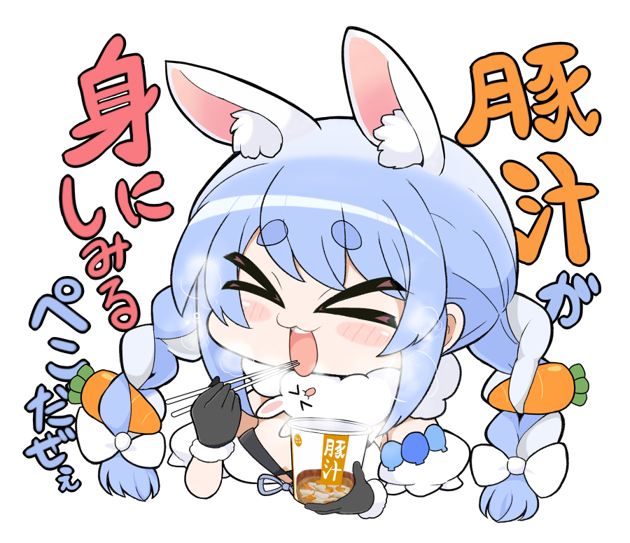 >_< 1girl :3 animal_ear_fluff animal_ears black_gloves blue_hair bow braid breasts carrot_hair_ornament chopsticks closed_eyes commentary_request instant_cup_noodles don-chan_(usada_pekora) food-themed_hair_ornament fur-trimmed_gloves fur_trim gloves hair_bow hair_ornament hololive instant_cup_noodles instant_noodles long_hair matarou_(matarou072) multicolored_hair open_mouth rabbit_ears rabbit_girl simple_background small_breasts smile solo steam thick_eyebrows translation_request twin_braids two-tone_hair upper_body usada_pekora usada_pekora_(1st_costume) virtual_youtuber white_background white_hair