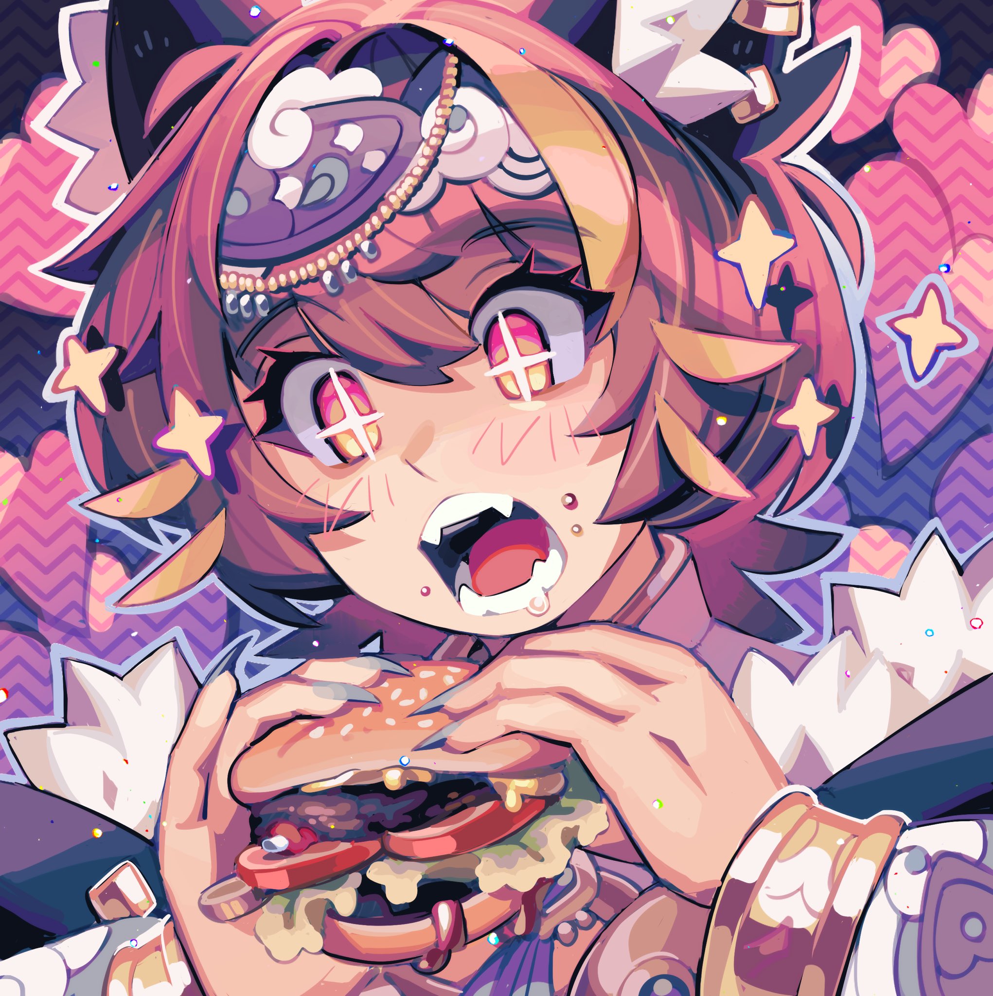 1girl animal_ear_fluff animal_ears blonde_hair blush brown_hair burger cat_ears commentary crumbs english_commentary fangs fingernails food gradient_eyes hairband highres holding holding_burger holding_food kanami_kaito lettuce multicolored_eyes multicolored_hair nexas_(vtuber) open_mouth remi_(mozzaremi) saliva second-party_source solo sparkle streaked_hair tomato tongue virtual_youtuber yellow_eyes