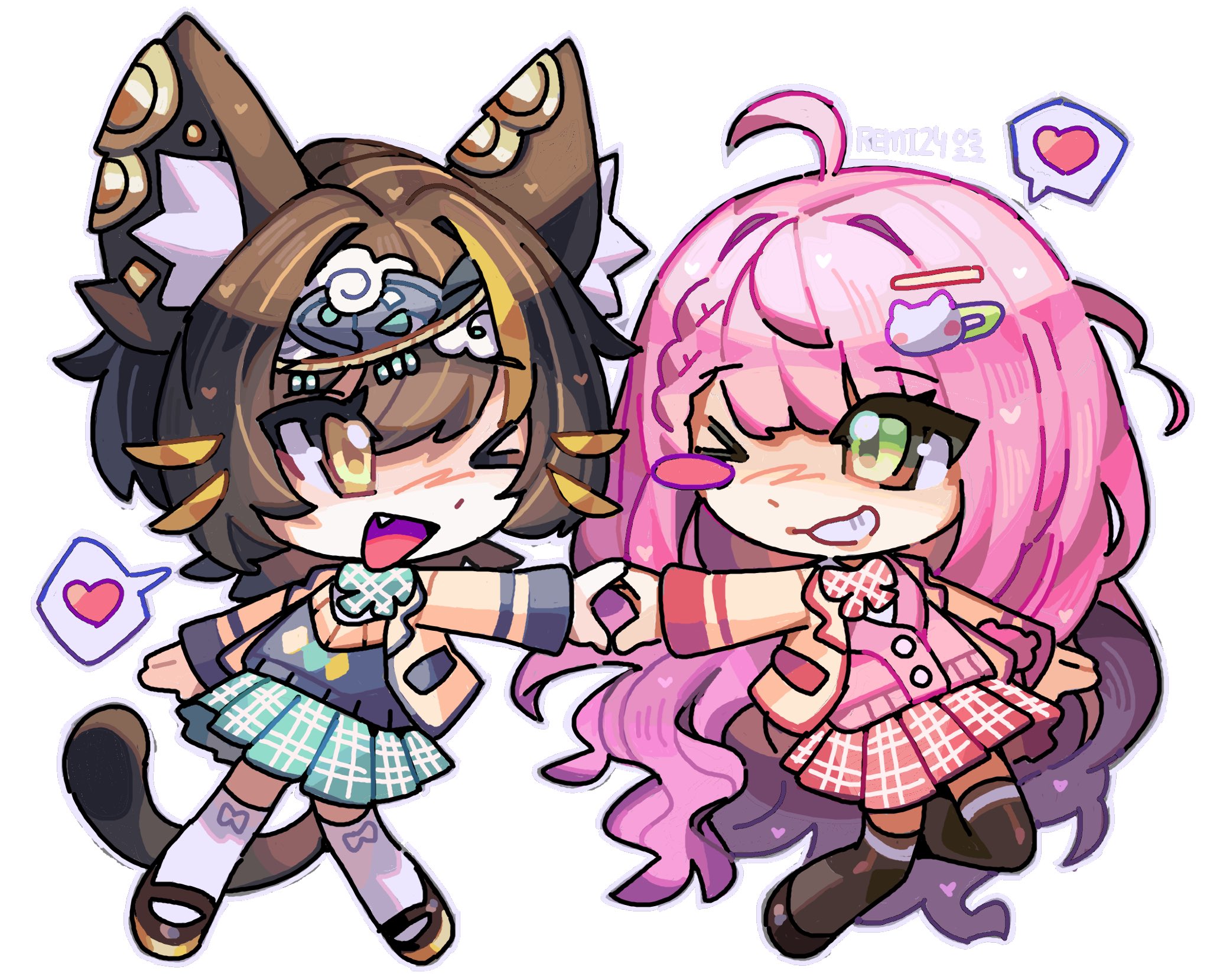 2024 2girls ;d ahoge alternate_costume animal_ear_fluff animal_ears argyle_clothes artist_name black_footwear black_sweater_vest black_thighhighs blazer blonde_hair blush bow bowtie brown_footwear brown_hair cat_ears chibi commentary dated dot_nose english_commentary fang fish full_body green_bow green_bowtie green_eyes green_skirt grin hairband heart highres jacket kanami_kaito long_hair long_sleeves looking_at_another momoko_nuihara multicolored_hair multiple_girls nexas_(vtuber) one_eye_closed open_mouth pink_bow pink_bowtie pink_hair pink_skirt pink_sweater_vest plaid_bow plaid_bowtie plaid_clothes plaid_skirt pleated_skirt remi_(mozzaremi) second-party_source shirt simple_background skirt sleeves_past_wrists smile speech_bubble spoken_heart standing streaked_hair sweater_vest tail teeth thighhighs tongue two-tone_hair very_long_hair virtual_youtuber whiskers white_background white_shirt white_thighhighs yellow_eyes