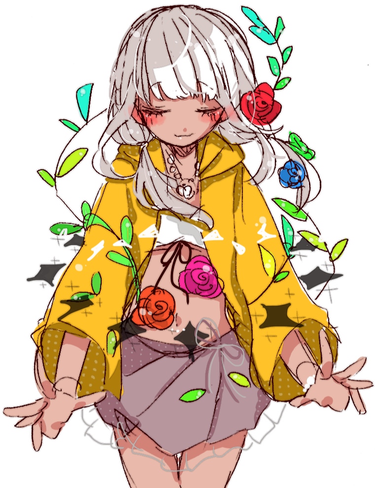 1girl bead_bracelet beads bikini bikini_ribbon black_ribbon blue_flower blue_rose blunt_bangs blush_stickers bracelet closed_eyes closed_mouth commentary_request cowboy_shot danganronpa_(series) danganronpa_v3:_killing_harmony dark-skinned_female dark_skin eyelashes flower frilled_skirt frills grey_ribbon grey_skirt hair_over_shoulder hiyomikun hood hood_down hooded_coat jewelry leaf long_hair long_sleeves low_twintails miniskirt navel orange_flower orange_rose pink_flower pink_rose plant pleated_skirt raincoat red_flower red_rose ribbon rose simple_background skirt smile solo sparkle stomach straight-on swimsuit twintails vines waist_ribbon white_background white_bikini white_hair yellow_raincoat yonaga_angie