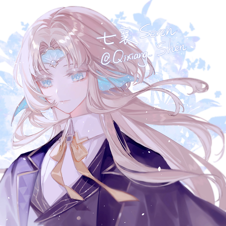 1girl blonde_hair blue_coat blue_eyes blue_suit bow bowtie coat collared_shirt fins floating_hair forehead_jewel formal_clothes gem head_fins honkai:_star_rail honkai_(series) long_hair looking_down parted_bangs pearl_(gemstone) pearl_(honkai:_star_rail) portrait qixiang_seren shirt signature simple_background solo suit twitter_username white_shirt yellow_bow yellow_bowtie
