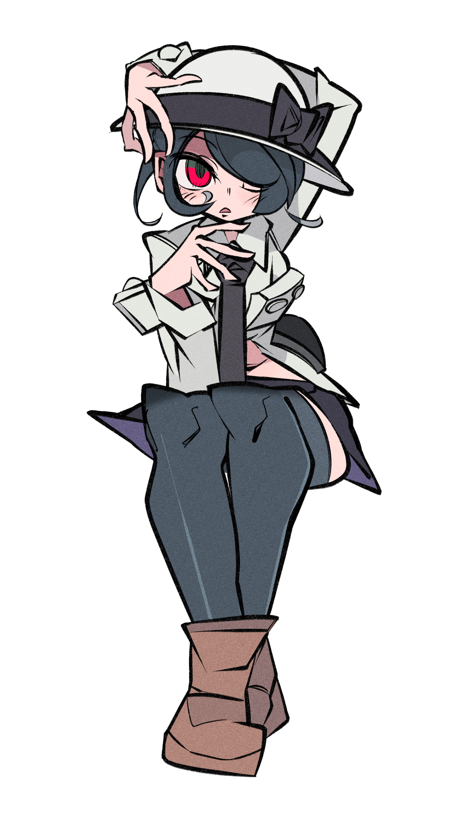 1girl absurdres black_hair blush cxdotchison facing_viewer filia_(skullgirls) hair_over_one_eye hand_on_headwear hat hat_ribbon highres looking_at_viewer necktie parted_lips pleated_skirt red_eyes ribbon school_uniform sitting skirt skullgirls solo thighhighs white_background