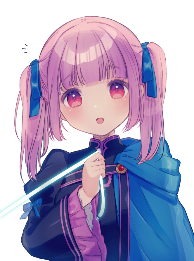 1girl :d black_dress blue_bow blue_cape bow cape dress glowing hair_bow hannelore_(honzuki_no_gekokujou) honzuki_no_gekokujou juliet_sleeves long_sleeves looking_at_viewer notice_lines open_mouth pink_hair puffy_sleeves red_eyes rinndouk side_cape simple_background smile solo twintails upper_body white_background wide_sleeves