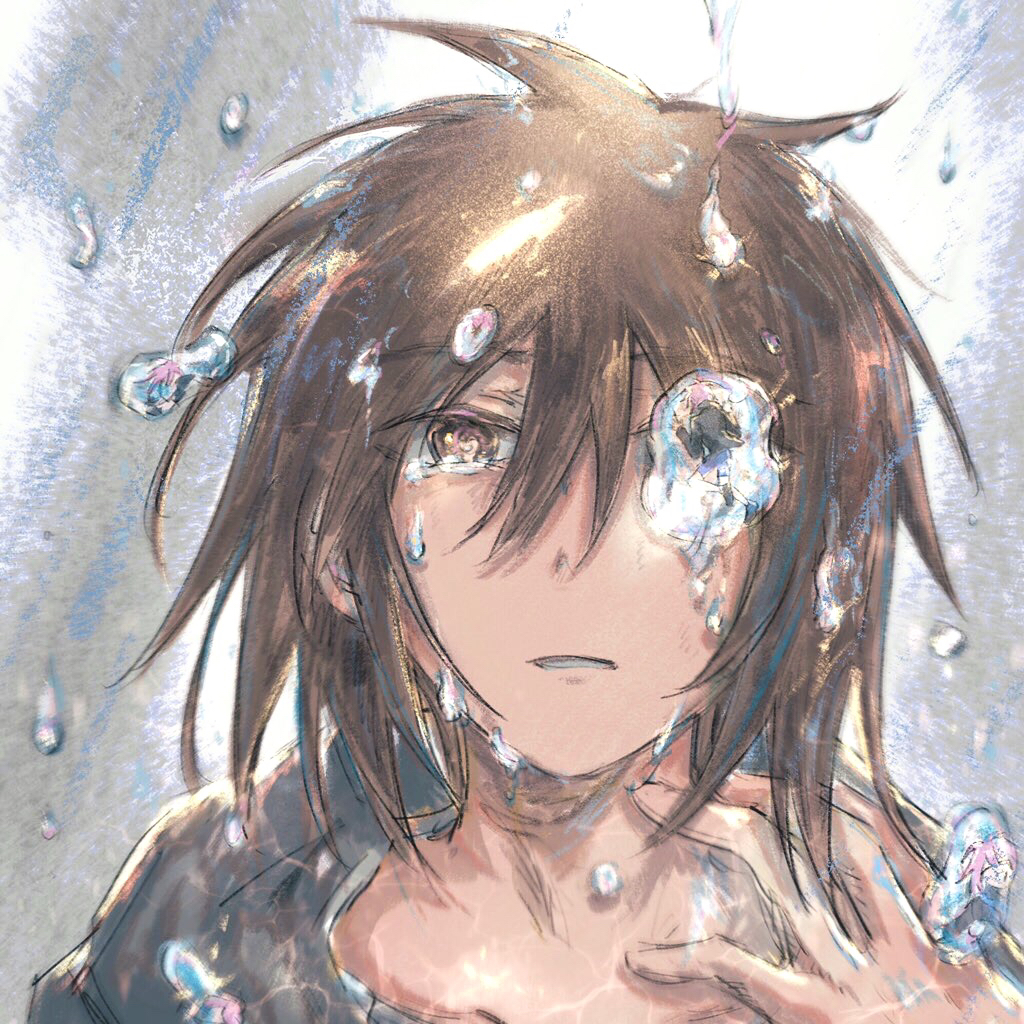 2boys black_jacket blue_shorts brown_hair cengfanren chinese_commentary closed_eyes commentary_request crying crying_with_eyes_open hair_between_eyes hand_on_own_chest isoi_haruki jacket male_focus medium_hair multiple_boys origin_alpha parted_lips pink_hair portrait saibou_shinkyoku shorts smile solo_focus tears water_drop