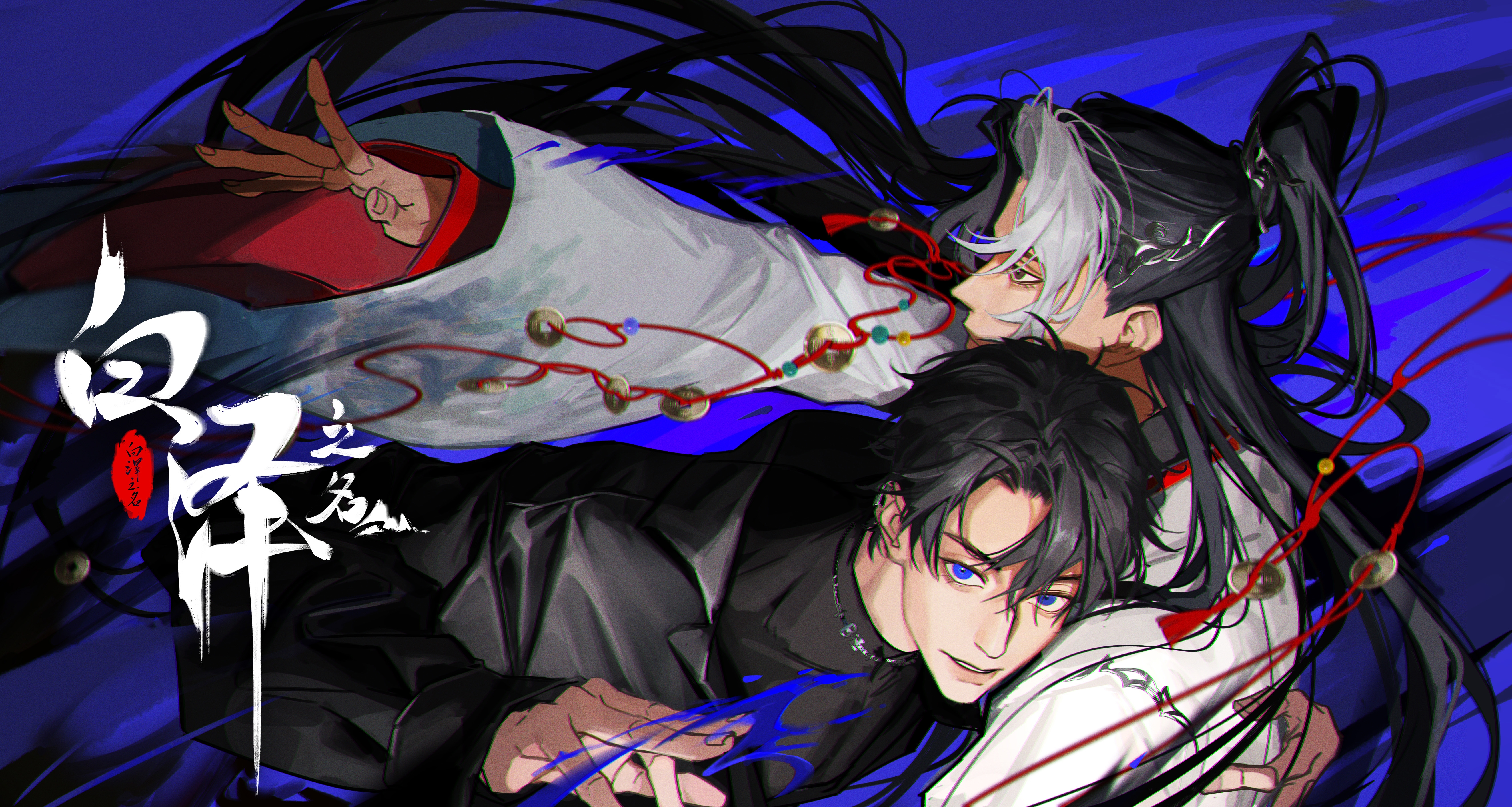 2boys absurdres beads black_eyes black_hair black_jacket black_shirt blue_background blue_eyes character_request chinese_clothes chinese_text coat coin copyright_request fingernails hair_ornament hand_on_another's_back highres jacket lapels lips long_hair long_sleeves looking_afar looking_at_viewer multicolored_hair multiple_boys notched_lapels one_side_up parted_bangs parted_lips shirt short_hair simple_background thread turtleneck two-tone_hair upper_body white_coat white_hair wide_sleeves xiaoyia134