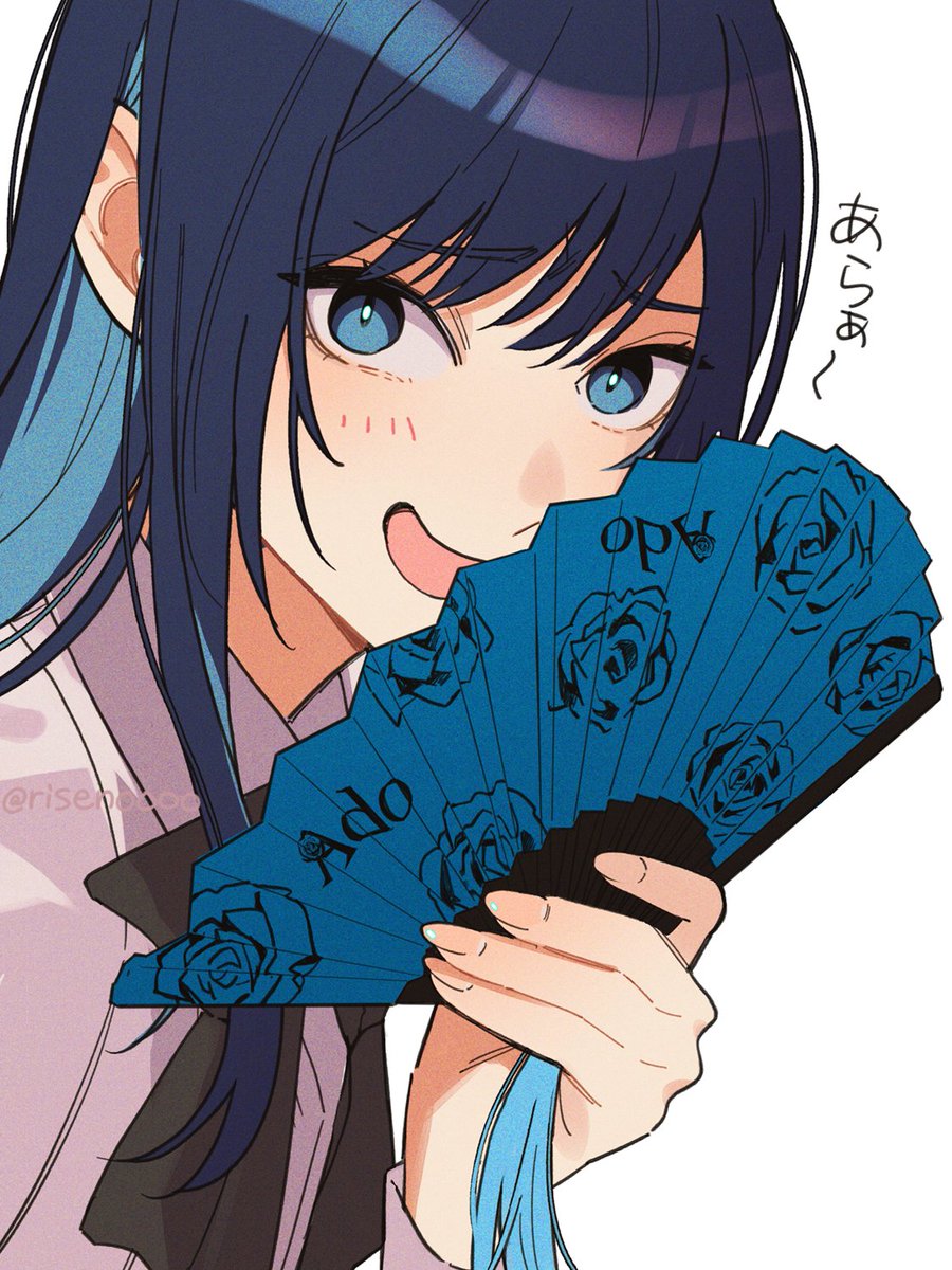 1girl ado_(utaite) black_bow black_bowtie blue_eyes blue_hair blush bow bowtie chando_(ado) collared_shirt colored_inner_hair commentary dark_blue_hair hand_fan hashtag-only_commentary highres long_hair multicolored_hair open_mouth riseno shirt sidelocks simple_background solo translated twitter_username upper_body utaite white_background white_shirt