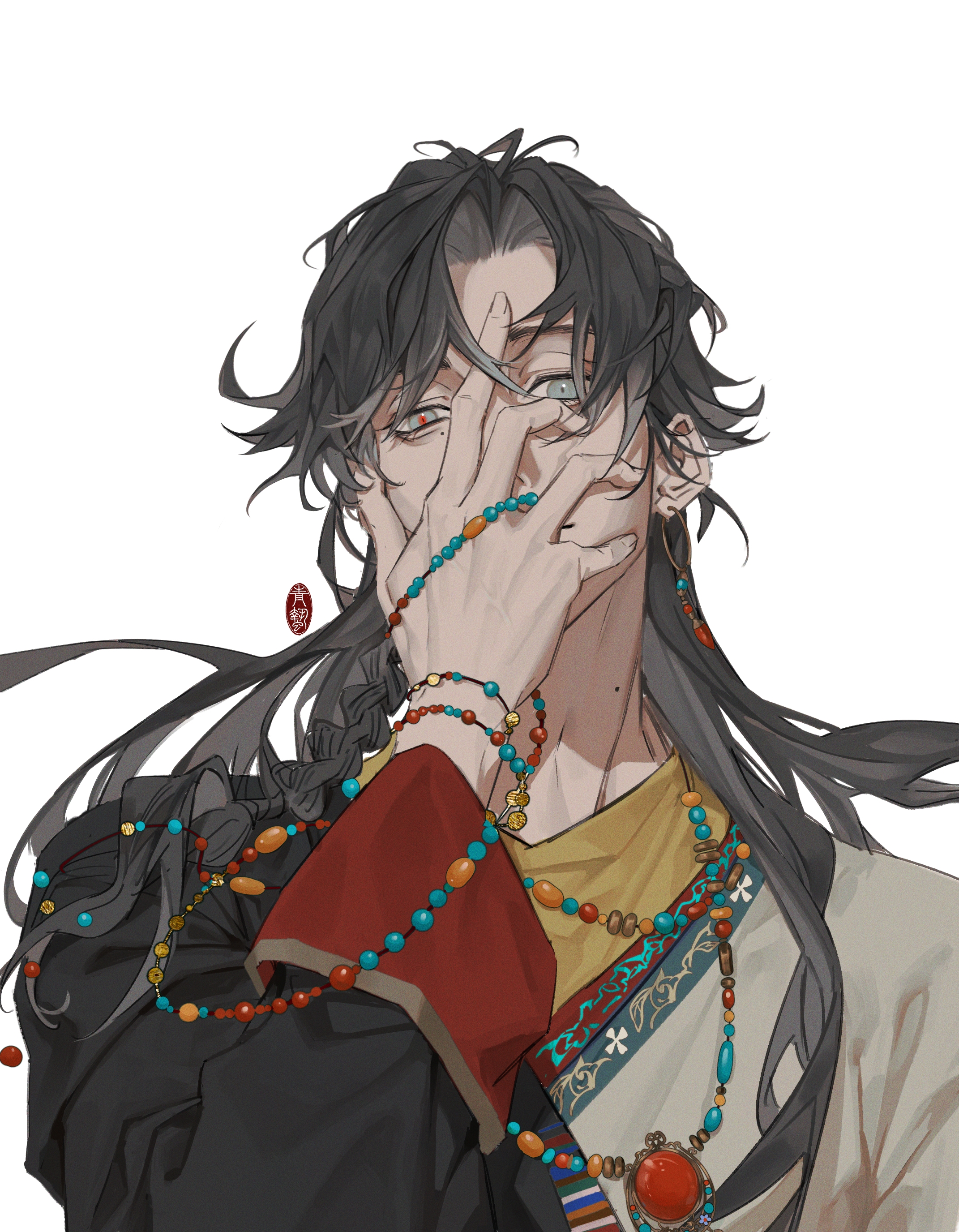 1boy absurdres asymmetrical_sleeves bead_bracelet bead_necklace beads black_hair bracelet character_request copyright_request covered_mouth fingernails gem grey_eyes hand_on_own_face highres jewelry long_hair long_sleeves looking_at_viewer male_focus mole mole_on_neck mole_under_eye necklace parted_bangs red_gem sidelocks simple_background solo upper_body white_background xiaoyia134