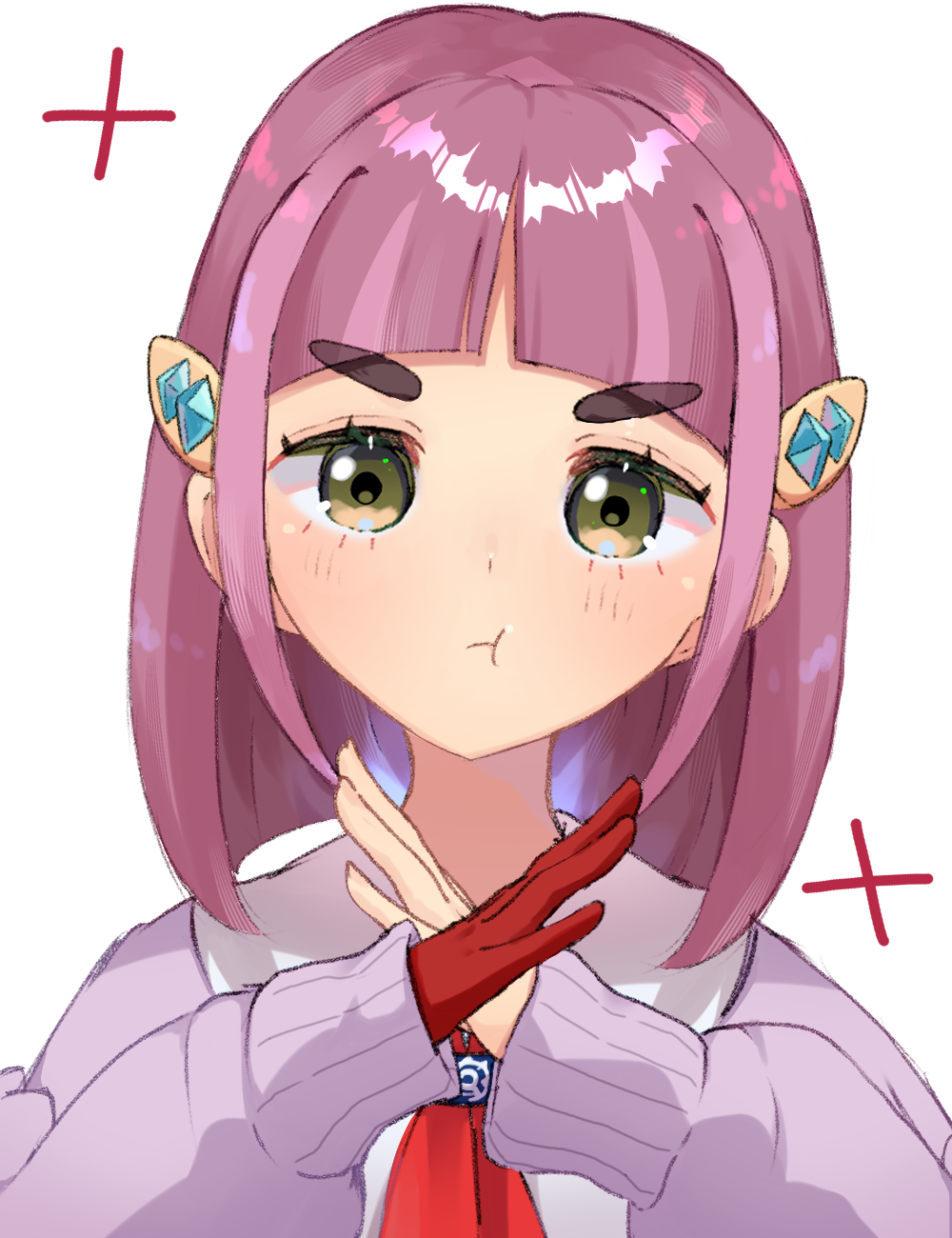 1girl :t arched_bangs blush cardigan closed_mouth commentary_request crossed_arms eyelashes green_eyes hair_ornament hairclip highres lacey_(pokemon) long_sleeves looking_at_viewer medium_hair nintendo pokemon pokemon_scarlet_and_violet pout purple_cardigan purple_hair rosyehosii shirt sidelocks simple_background solo upper_body white_background white_shirt