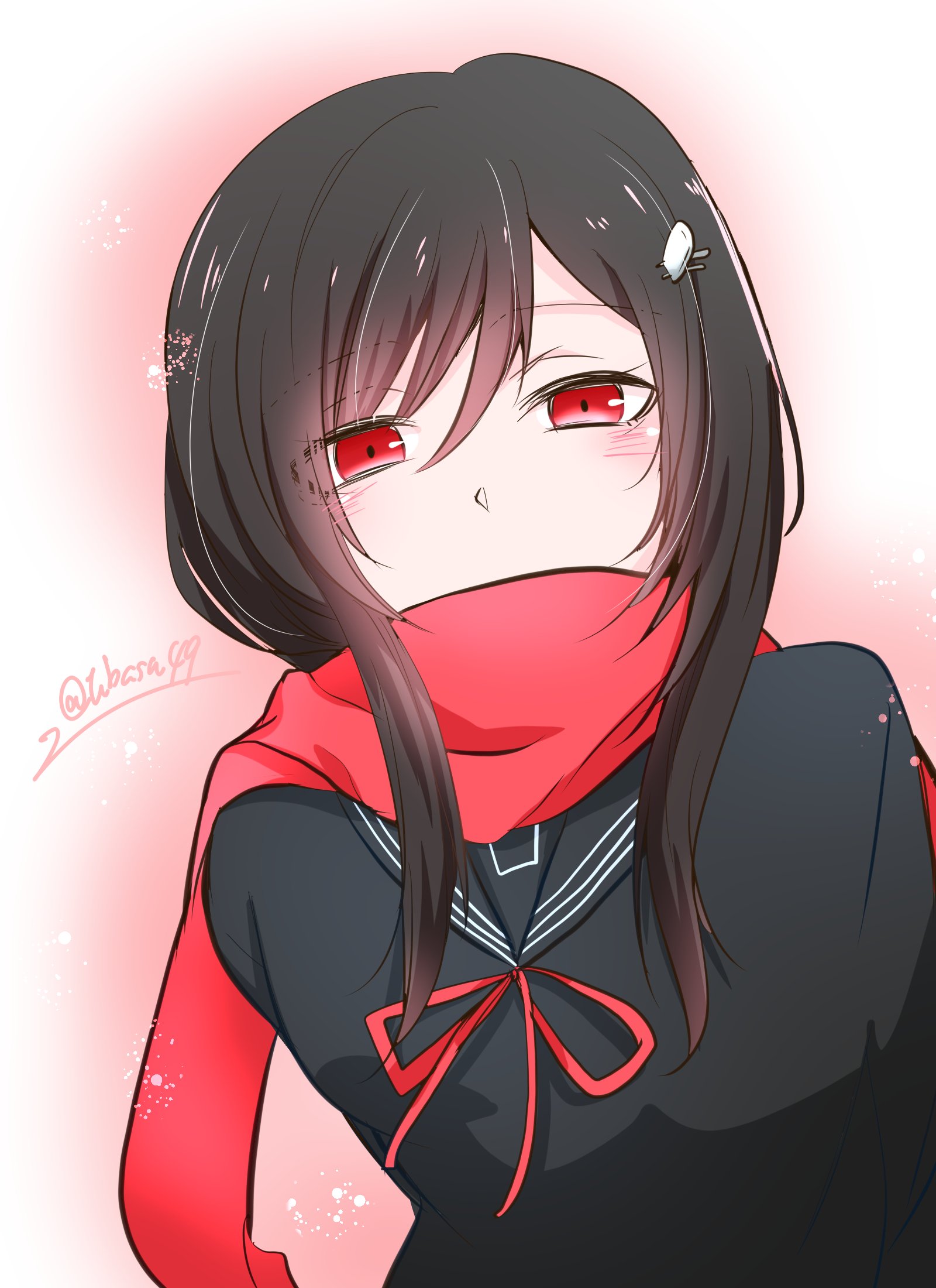 1girl arms_behind_back black_hair black_serafuku black_shirt blush commentary_request hair_ornament hairclip highres long_hair long_sleeves looking_at_viewer red_eyes red_ribbon red_scarf ribbon sailor_collar sayo_samonji_(tenka_hyakken) scarf scarf_over_mouth school_uniform serafuku shirt sidelocks simple_background solo tenka_hyakken tubasa49 twitter_username upper_body