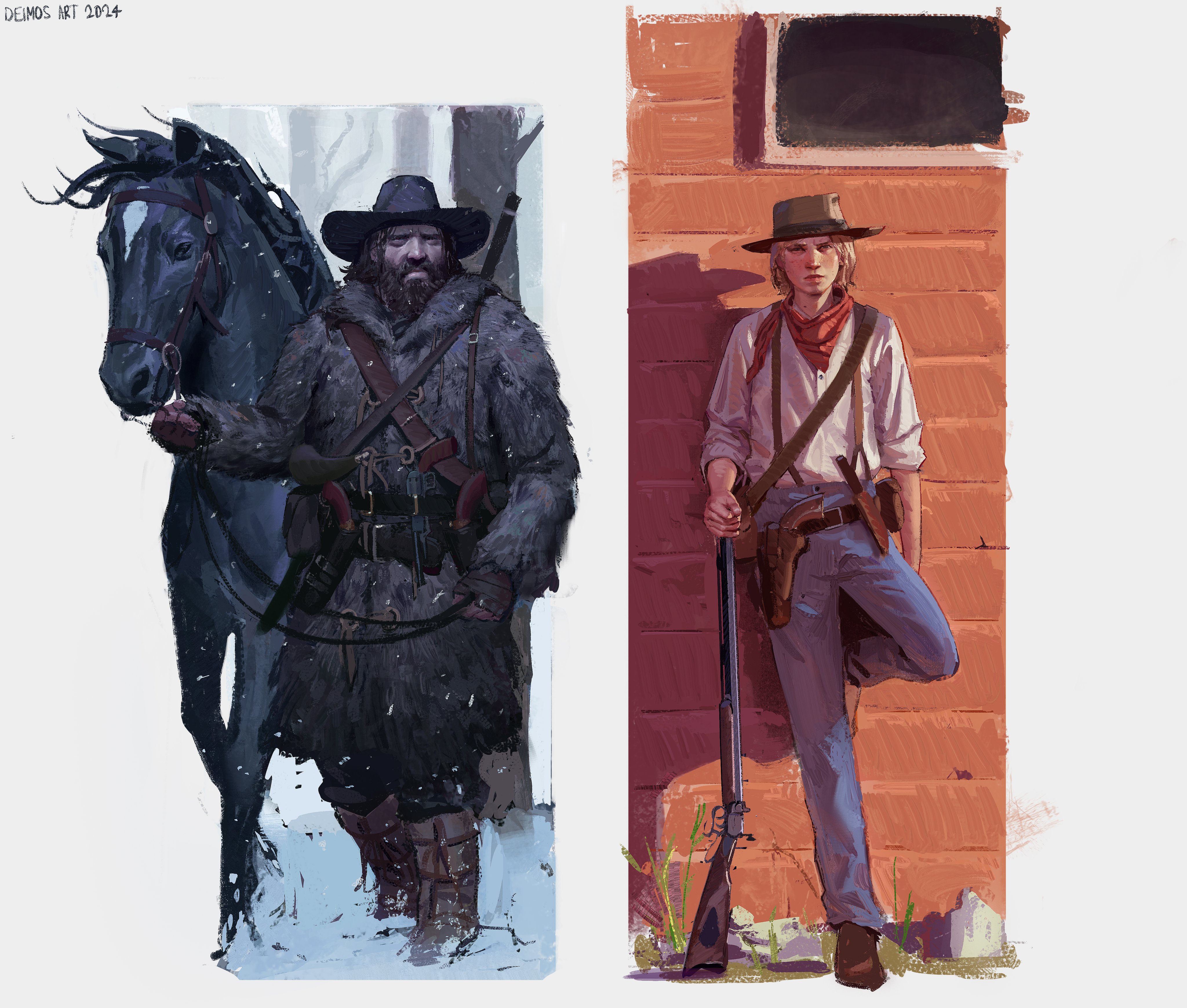 2boys absurdres beard blood_meridian coat cowboy_hat deimos_art facial_hair fur_coat gun handgun hat highres holster holstered horse multiple_boys revolver rifle simple_background snow snowing suspenders the_kid_(blood_meridian) weapon white_background