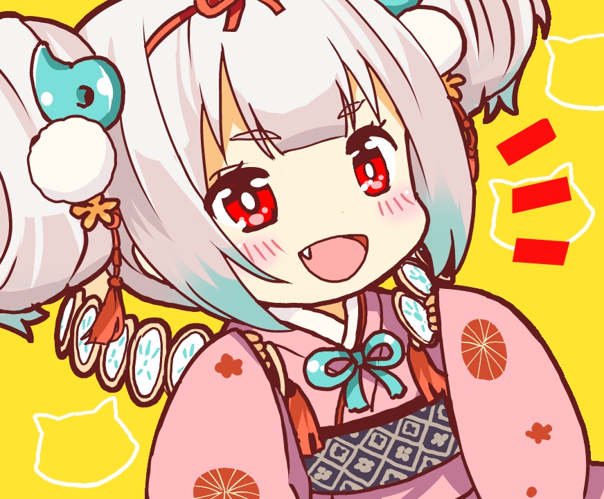1girl alternate_hairstyle aqua_hair blush chibi commentary_request double_bun fang hair_bun hair_ornament japanese_clothes jin_kansai kimono long_sleeves magatama magatama_hair_ornament notice_lines obi open_mouth pink_kimono pom_pom_(clothes) print_sash red_eyes sash solo tassel tassel_hair_ornament tenka_hyakken thick_eyebrows tsuda_echizen-no-kami_sukehiro white_hair wide_sleeves yellow_background