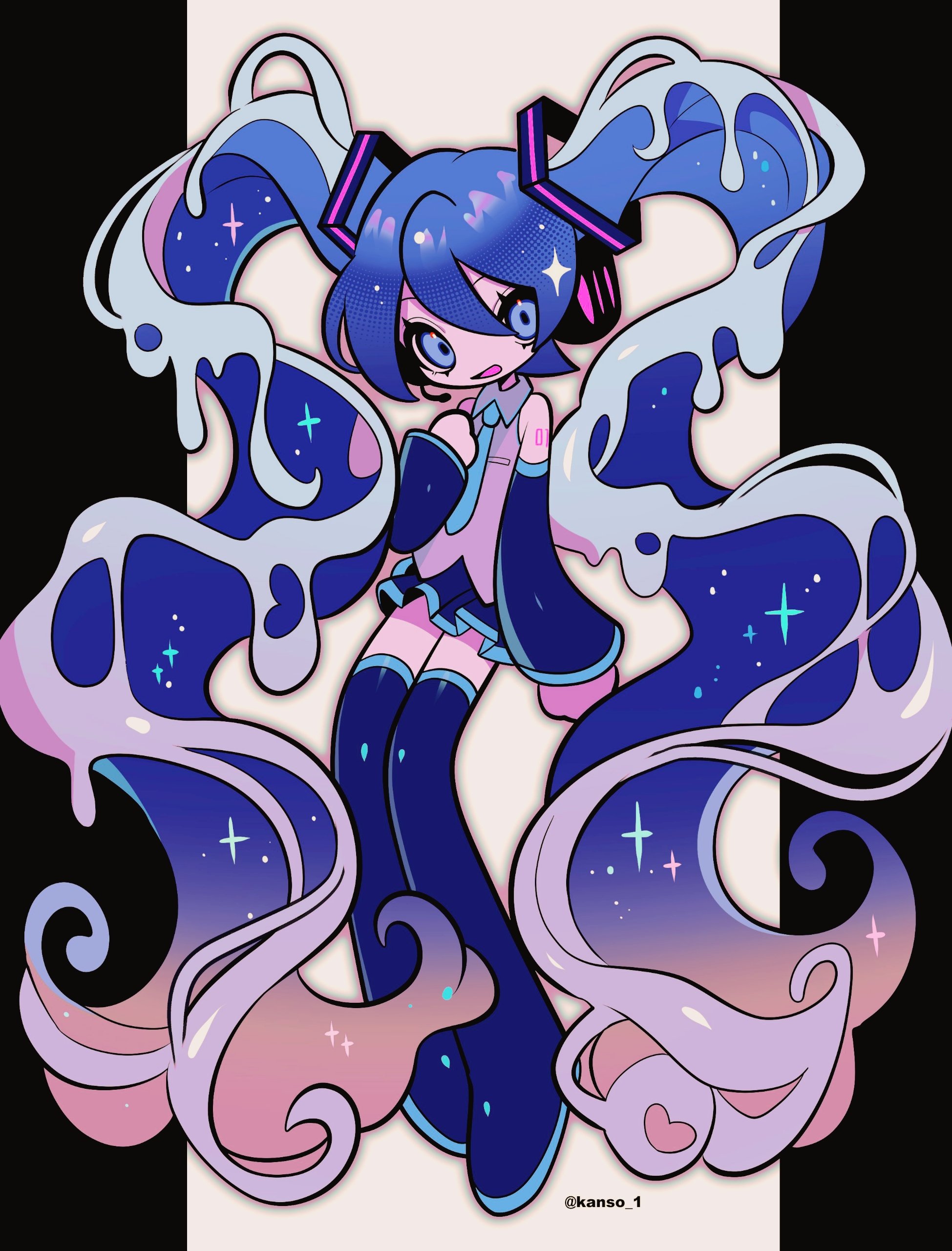1girl :d absurdly_long_hair absurdres artist_name bare_shoulders blue_boots blue_eyes blue_hair blue_necktie blue_skirt blue_sleeves boots detached_sleeves full_body grey_shirt hatsune_miku headset heart highres kansou_(kanso_1) liquid_hair long_hair looking_at_viewer necktie open_mouth shaped_liquid shirt skirt sleeveless sleeveless_shirt smile solo sparkle thigh_boots very_long_hair vocaloid